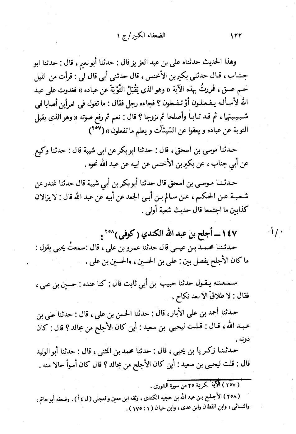 §147 - أَجْلَجُ بْنُ عَبْدِ اللَّهِ الْكِنْدِيُّ كُوفِيٌّ حَدَّثَنَا مُحَمَّدُ بْنُ عِيسَى قَالَ حَدَّثَنَا عَمْرُو بْنُ عَلِيٍّ قَالَ: سَمِعْتُ يَحْيَى، يَقُولُ: مَا كَانَ الْأَجْلَجُ يَفْصِلُ بَيْنَ عَلِيِّ بْنِ الْحُسَيْنِ، وَالْحُسَيْنِ بْنِ عَلِيٍّ. سَمِعْتُهُ يَقُولُ: حَدَّثَنَا حَبِيبُ بْنُ أَبِي ثَابِتٍ قَالَ: كُنَّا عِنْدَهُ حُسَيْنُ بْنُ عَلِيٍّ فَقَالَ: لَا طَلَاقَ إِلَّا بَعْدَ نِكَاحٍ. حَدَّثَنَا أَحْمَدُ بْنُ عَلِيٍّ الْأَبَّارُ قَالَ: حَدَّثَنَا الْحَسَنُ بْنُ عَلِيٍّ قَالَ: حَدَّثَنَا عَلِيُّ بْنُ عَبْدِ اللَّهِ قَالَ: قُلْتُ لِيَحْيَى بْنِ سَعِيدٍ: أَيْنَ كَانَ الْأَجْلَجُ مِنْ مُجَالِدٍ؟ قَالَ: كَانَ دُونَهُ. حَدَّثَنَا زَكَرِيَّا بْنُ يَحْيَى قَالَ: حَدَّثَنَا مُحَمَّدُ بْنُ الْمُثَنَّى قَالَ: حَدَّثَنَا أَبُو الْوَلِيدِ قَالَ: قُلْتُ لِيَحْيَى بْنِ سَعِيدٍ: أَيْنَ كَانَ الْأَجْلَجُ مِنْ مُجَالِدٍ؟ قَالَ كَانَ أَسْوَأَ حَالًا مِنْهُ -[123]-. حَدَّثَنَا مُحَمَّدُ بْنُ عِيسَى قَالَ: حَدَّثَنَا صَالِحٌ قَالَ: حَدَّثَنَا عَلِيٌّ قَالَ: قُلْتُ لِيَحْيَى: فَأَجْلَجُ؟ قَالَ: فِي نَفْسِي مِنْهُ شَيْءٌ. حَدَّثَنَا عَبْدُ اللَّهِ بْنُ أَحْمَدَ قَالَ: سَمِعْتُ أَبِي يَقُولُ: مَا أَقْرَبَ الْأَجْلَجَ مِنْ فِطْرِ بْنِ خَلِيفَةَ