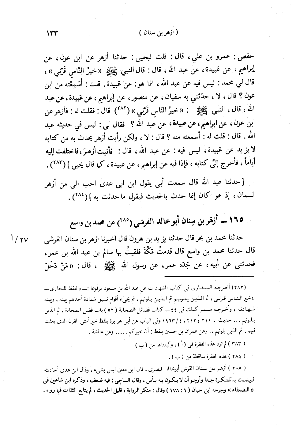 165 - حَدَّثَنَا مُحَمَّدُ بْنُ جَعْفَرِ بْنِ مُحَمَّدٍ الْبَغْدَادِيُّ ابْنُ أَخِي الْإِمَامِ قَالَ: سَمِعْتُ أَبَا حَفْصٍ عَمْرَو بْنَ عَلِيٍّ قَالَ: قُلْتُ لِيَحْيَى: حَدَّثَنَا أَزْهَرُ، عَنِ ابْنِ عَوْنٍ، عَنْ إِبْرَاهِيمَ، عَنْ عَبِيْدَةَ، عَنْ عَبْدِ اللَّهِ، قَالَ: قَالَ النَّبِيُّ صَلَّى اللهُ عَلَيْهِ وَسَلَّمَ: «§خَيْرُ النَّاسِ قَرْنِي» قَالَ لِي مُحَمَّدٌ: لَيْسَ فِيهِ عَنْ عَبْدِ اللَّهِ إِنَّمَا هُوَ عَنْ عُبَيْدَةَ، قُلْتُ: أَسَمِعْتَهُ مِنِ ابْنِ عَوْنٍ؟ قَالَ: لَا حَدَّثَنِي بِهِ سُفْيَانُ، عَنْ مَنْصُورٍ، عَنْ إِبْرَاهِيمَ، عَنْ عُبَيْدَةَ، عَنْ عَبْدِ اللَّهِ، قَالَ النَّبِيُّ صَلَّى اللهُ عَلَيْهِ وَسَلَّمَ «خَيْرُ النَّاسِ قَرْنِي» قَالَ: قُلْتُ لَهُ: فَأَزْهَرُ عَنِ ابْنِ عَوْنٍ، عَنْ إِبْرَاهِيمَ، عَنْ عُبَيْدَةَ، عَنْ عَبْدِ اللَّهِ، فَقَالَ لِي: لَيْسَ فِي حَدِيثِهِ عَبْدُ اللَّهِ، قَالَ: قُلْتُ لَهُ: أَسَمِعْتَهُ مِنْهُ؟ قَالَ: لَا، وَلَكِنْ رَأَيْتُ أَزْهَرَ يُحَدِّثُ بِهِ مِنْ كِتَابِهِ لَا يَزِيدُ عَنْ عُبَيْدَةَ، لَيْسَ فِيهِ عَنْ عَبْدِ اللَّهِ، قَالَ: فَأَتَيْتُ أَزْهَرَ فَاخْتَلَفْتُ إِلَيْهِ أَيَّامًا، فَأَخْرَجَ إِلَىَّ كِتَابَهُ فَإِذَا فِيهِ، عَنْ إِبْرَاهِيمَ، عَنْ عُبَيْدَةَ، كَمَا قَالَ يَحْيَى