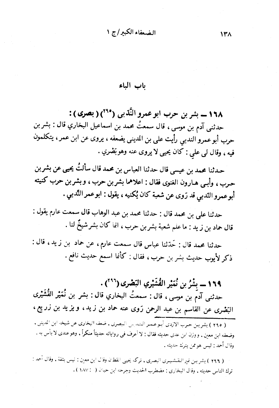 §بِشْرُ بْنُ حَرْبٍ أَبُو عَمْرٍو النَّدَبِيُّ بَصْرِيٌّ حَدَّثَنِي آدَمُ بْنُ مُوسَى قَالَ: سَمِعْتُ مُحَمَّدَ بْنَ إِسْمَاعِيلَ الْبُخَارِيَّ قَالَ: بِشْرُ بْنُ حَرْبٍ أَبُو عَمْرٍو النَّدَبِيُّ رَأَيْتُ عَلِيَّ بْنَ الْمَدِينِيَّ يُضَعِّفُهُ يَرْوِي عَنِ ابْنِ عُمَرَ يَتَكَلَّمُونَ فِيهِ، وَقَالَ لِي عَلِيٌّ: كَانَ يَحْيَى لَا يَرْوِي عَنْهُ وَهُوَ بَصْرِيٌّ. حَدَّثَنَا مُحَمَّدُ بْنُ عِيسَى قَالَ: حَدَّثَنَا الْعَبَّاسُ بْنُ مُحَمَّدٍ قَالَ: سَأَلْتُ يَحْيَى عَنْ بِشْرِ بْنِ حَرْبٍ، وَأَبِي هَارُونَ الْعَبْدَلِيِّ فَقَالَ: أَعْلَاهُمَا بِشْرُ بْنُ حَرْبٍ. وَبِشْرُ بْنُ حَرْبٍ كُنْيَتُهُ أَبُو عَمْرٍو النَّدَبِيُّ قَدْ رَوَى عَنْ شُعْبَةَ، كَانَ يُكَنِّيهِ يَقُولُ: أَبُو عُمَرَ النَّدَبِيُّ. حَدَّثَنَا عَلِيُّ بْنُ مُحَمَّدٍ قَالَ: حَدَّثَنَا مُحَمَّدُ بْنُ عَبْدِ الْوَهَّابِ قَالَ: سَمِعْتُ عَارِمًا يَقُولُ: قَالَ حَمَّادُ بْنُ زَيْدٍ: مَا عَلِمَ شُعْبَةُ بِشْرَ بْنَ حَرْبٍ إِنَّمَا كَانَ بِشْرٌ شَيْخًا لَنَا. حَدَّثَنَا مُحَمَّدٌ قَالَ: حَدَّثَنَا عَبَّاسٌ قَالَ: سَمِعْتُ عَارِمًا عَنْ حَمَّادِ بْنِ زَيْدٍ قَالَ: ذُكِرَ لِأَيُّوبَ حَدِيثُ بِشْرِ بْنِ حَرْبٍ فَقَالَ: كَأَنَّمَا نَسْمَعُ حَدِيثَ نَافِعٍ