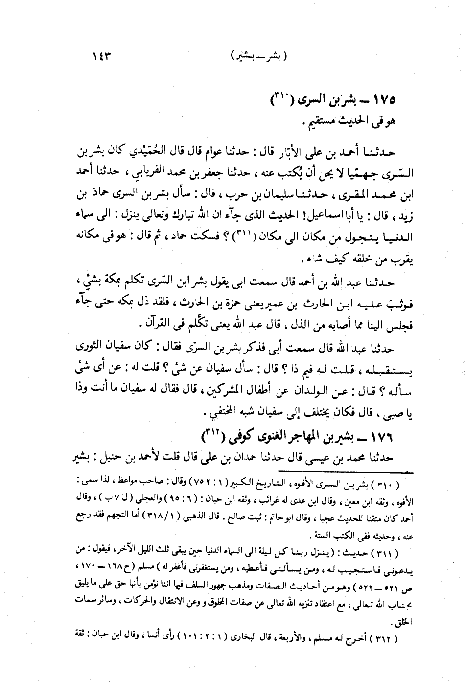 §175 - بِشْرُ بْنُ السَّرِيِّ هُوَ فِي الْحَدِيثِ مُسْتَقِيمٌ حَدَّثَنَا أَحْمَدُ بْنُ عَلِيٍّ الْأَبَّارُ قَالَ: حَدَّثَنَا عَوَّامُ بْنُ إِسْمَاعِيلَ قَالَ: قَالَ الْحُمَيْدِيُّ: كَانَ بِشْرُ بْنُ السُّرَى جَهْمِيًّا لَا يَحِلُّ أَنْ يُكْتَبَ عَنْهُ. حَدَّثَنَا جَعْفَرُ بْنُ مُحَمَّدٍ الْفِرْيَابِيُّ حَدَّثَنَا أَحْمَدُ بْنُ مُحَمَّدٍ الْمُقَدَّمِيُّ حَدَّثَنَا سُلَيْمَانُ بْنُ حَرْبٍ قَالَ: سَأَلَ بِشْرُ بْنُ السُّرَى حَمَّادَ بْنَ زَيْدٍ فَقَالَ: يَا أَبَا إِسْمَاعِيلَ الْحَدِيثُ الَّذِي جَاءَ «أَنَّ اللَّهَ تَبَارَكَ وَتَعَالَى يَنْزِلُ إِلَى سَمَاءِ الدُّنْيَا يَتَجَوَّلُ مِنْ مَكَانٍ إِلَى مَكَانٍ» فَسَكَتَ حَمَّادٌ ثُمَّ قَالَ: هُوَ فِي مَكَانِهِ يَقْرُبُ مِنْ خَلْقِهِ كَيْفَ شَاءَ. حَدَّثَنَا عَبْدُ اللَّهِ بْنُ أَحْمَدَ قَالَ: سَمِعْتُ أَبِي يَقُولُ بِشْرُ بْنُ السَّرِيِّ تَكَلَّمَ بِمَكَّةَ بِشَيْءٍ فَوَثَبَ عَلَيْهِ ابْنُ الْحَارِثِ بْنِ عُمَيْرٍ يَعْنِي حَمْزَةَ بْنَ الْحَارِثِ فَلَقَدْ ذُلَّ بِمَكَّةَ حَتَّى جَاءَ فَجَلَسَ إِلَيْنَا مِمَّا أَصَابَهُ مِنَ الذُّلِّ. قَالَ عَبْدُ اللَّهِ: يَعْنِي تَكَلَّمَ فِي الْقُرْآنِ. حَدَّثَنَا عَبْدُ اللَّهِ قَالَ: سَمِعْتُ أَبِي وَذَكَرَ بِشْرَ بْنَ السَّرِيِّ فَقَالَ: كَانَ سُفْيَانُ الثَّوْرِيُّ يَسْتَثْقِلُهُ قُلْتُ لَهُ: فِيمَ ذَا؟ قَالَ: سَأَلَ سُفْيَانَ عَنْ شَيْءٍ قُلْتُ لَهُ: عَنْ أَيِّ شَيْءٍ سَأَلَهُ؟ قَالَ: عَنِ الْوِلْدَانِ عَنْ أَطْفَالِ الْمُشْرِكِينَ، قَالَ: فَقَالَ لَهُ سُفْيَانُ: مَا أَنْتَ وَذَا يَا صَبِيُّ، قَالَ: فَكَانَ يَخْتَلِفُ إِلَى سُفْيَانَ شِبْهِ الْمُخْتَفِي