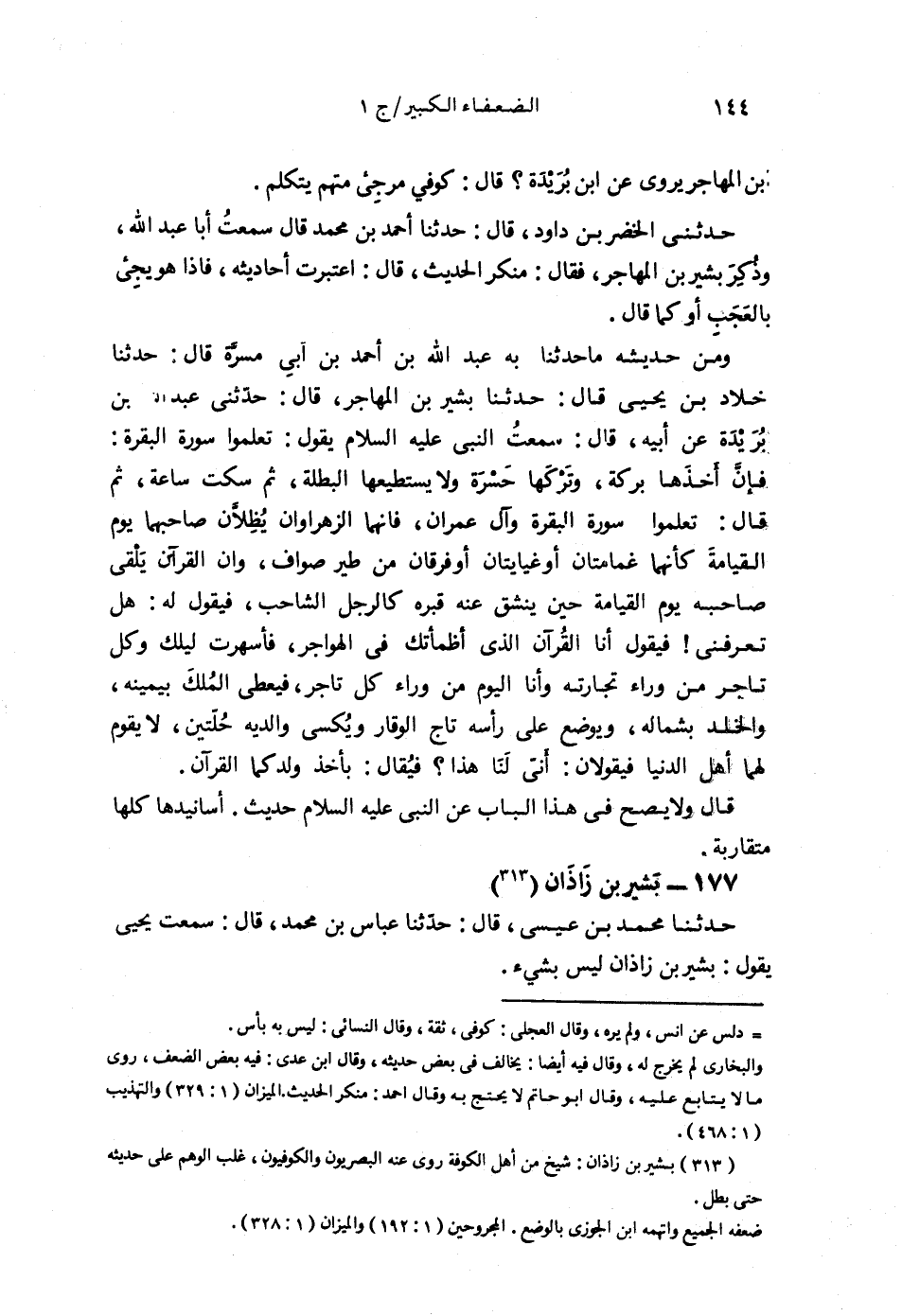 §177 - بَشِيرُ بْنُ زَاذَانَ حَدَّثَنَا مُحَمَّدُ بْنُ عِيسَى قَالَ: حَدَّثَنَا عَبَّاسُ بْنُ مُحَمَّدٍ قَالَ: سَمِعْتُ يَحْيَى يَقُولُ: بَشِيرُ بْنُ زَاذَانَ لَيْسَ بِشَيْءٍ