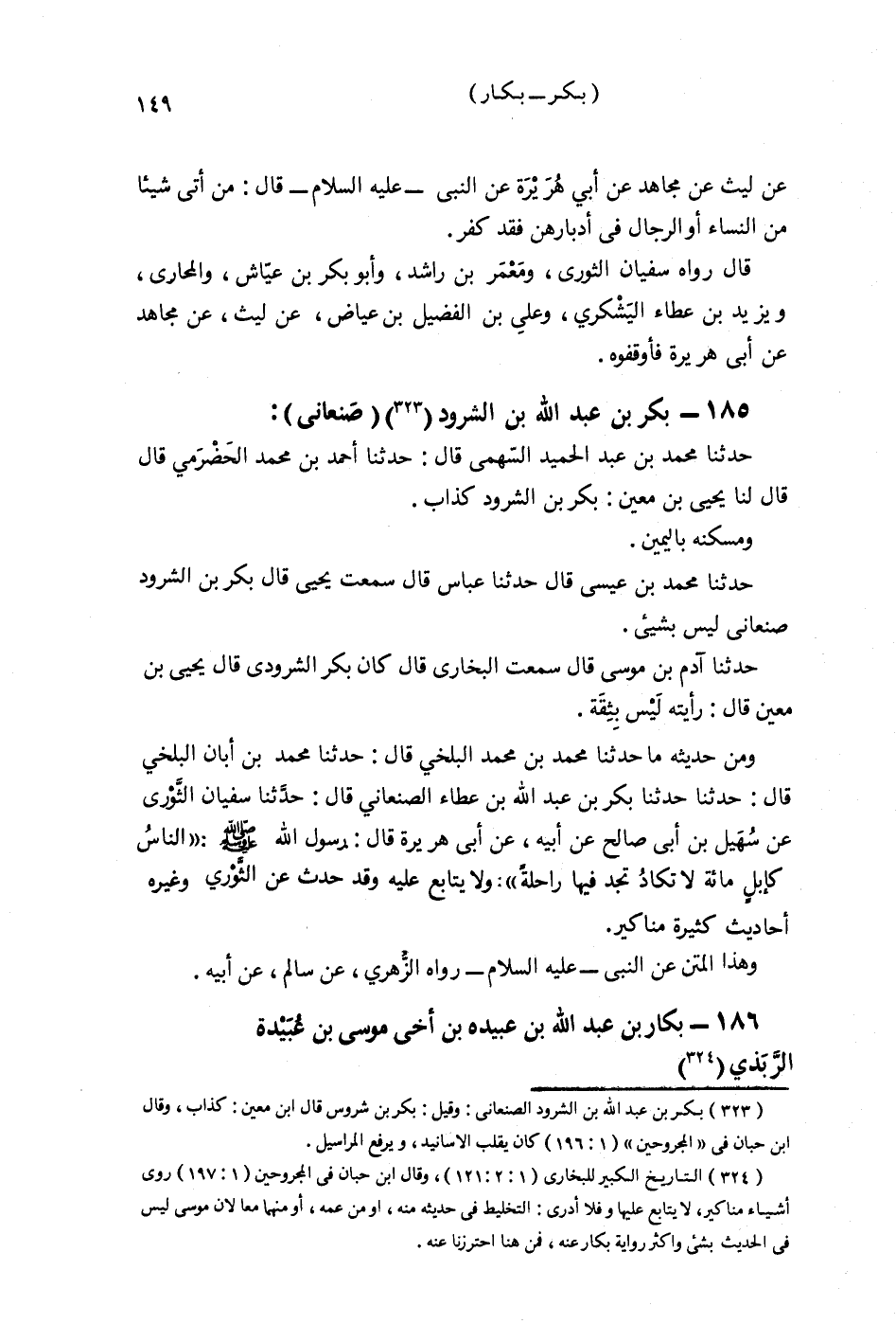§بَكْرُ بْنُ عَبْدِ اللَّهِ بْنِ الشَّرُودِ صَنْعَانِيٌّ حَدَّثَنَا مُحَمَّدُ بْنُ عَبْدِ الْحَمِيدِ السَّهْمِيُّ قَالَ: حَدَّثَنَا أَحْمَدُ بْنُ مُحَمَّدٍ الْحَضْرَمِيُّ قَالَ: قَالَ لَنَا يَحْيَى بْنُ مَعِينٍ: بَكْرُ بْنُ الشَّرُودِ كَذَّابٌ وَمَسْكَنُهُ بِالْيَمَنِ. حَدَّثَنَا مُحَمَّدُ بْنُ عِيسَى قَالَ: حَدَّثَنَا عَبَّاسٌ قَالَ: سَمِعْتُ يَحْيَى قَالَ: بَكْرُ بْنُ الشَّرُودِ صَنْعَانِيُّ لَيْسَ بِشَيْءٍ. حَدَّثَنَا آدَمُ بْنُ مُوسَى قَالَ: سَمِعْتُ الْبُخَارِيَّ قَالَ: كَانَ بَكْرُ بْنُ الشَّرُودِ قَالَ يَحْيَى بْنُ مَعِينٍ قَدْ رَأَيْتُهُ لَيْسَ بِثِقَةٍ