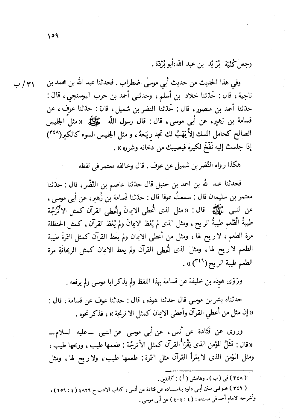 فَحَدَّثَنَا عَبْدُ اللَّهِ بْنُ أَحْمَدَ بْنِ حَنْبَلٍ قَالَ: حَدَّثَنَا عَاصِمُ بْنُ النَّضْرِ قَالَ: حَدَّثَنَا مُعْتَمِرُ بْنُ سُلَيْمَانَ قَالَ: سَمِعْتُ عَوْفًا قَالَ: حَدَّثَنَا قَسَامَةُ بْنُ زُهَيْرٍ، عَنْ أَبِي مُوسَى، عَنِ النَّبِيِّ صَلَّى اللهُ عَلَيْهِ وَسَلَّمَ قَالَ: «§مَثَلُ الَّذِي أُعْطِيَ الْإِيمَانَ وَأُعْطِيَ الْقُرْآنَ كَمَثَلِ الْأُتْرُنْجَةِ، طَيْبَةُ الطَّعْمِ طَيْبَةُ الرِّيحِ، وَمَثَلُ الَّذِي لَمْ يُعْطَ الْإِيمَانَ وَلَمْ يُعْطَ الْقُرْآنَ كَمَثَلِ الْحَنْظَلَةِ، مُرَّةُ الطَّعْمِ لَا رِيحَ لَهَا وَمَثَلُ الَّذِي أُعْطِيَ الْقُرْآنُ وَلَمْ يُعْطَ الْإِيمَانُ كَمَثَلِ الرَّيْحَانَةِ الطَّعْمِ طَيْبَةُ الرِّيحِ» وَرَوَى هَوْذَةُ بْنُ خَلِيفَةَ عَنْ عَوْفٍ عَنْ قَسَامَةَ بِهَذَا اللَّفْظِ وَلَمْ يَذْكُرْ أَبَا مُوسَى وَلَمْ يَرْفَعْهُ حَدَّثَنَاهُ بِشْرُ بْنُ مُوسَى قَالَ: حَدَّثَنَا هَوْذَةُ قَالَ: حَدَّثَنَا عَوْفٌ، عَنْ قَسَامَةَ قَالَ: «إِنَّ مَثَلَ مَنْ أُعْطِيَ الْقُرْآنُ وَأُعْطِيَ الْإِيمَانُ كَمَثَلِ الْأُتْرُنْجَةِ. . .» فَذَكَرَ نَحْوَهُ