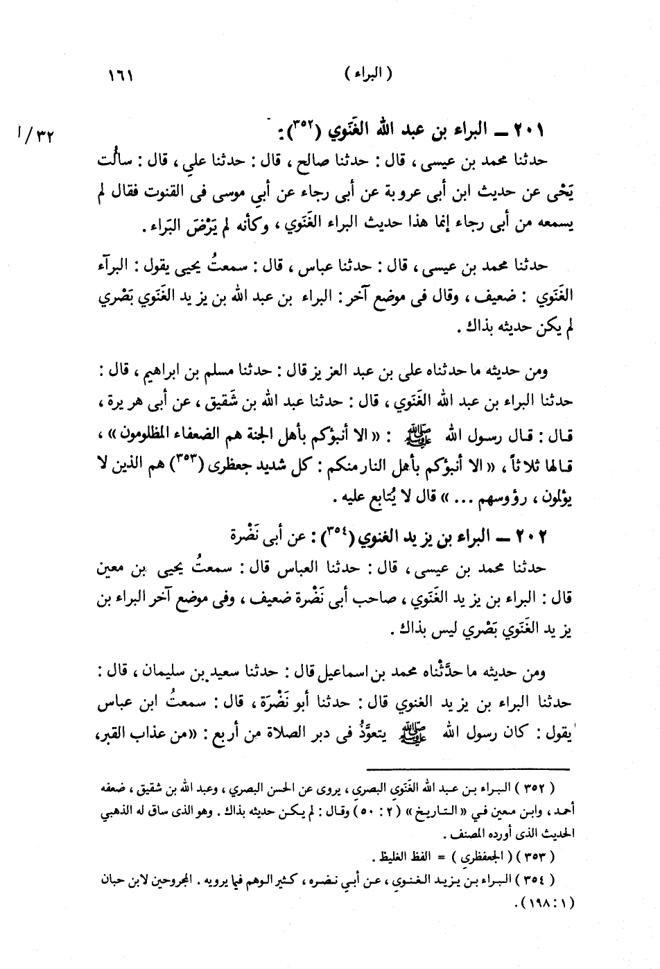 §202 - الْبَرَاءُ بْنُ عَبْدِ اللَّهِ الْغَنَوِيُّ حَدَّثَنَا مُحَمَّدُ بْنُ عِيسَى قَالَ: حَدَّثَنَا صَالِحٌ قَالَ: حَدَّثَنَا عَلِيٌّ قَالَ: سَأَلْتُ يَحْيَى عَنْ حَدِيثِ ابْنِ أَبِي عَرُوبَةَ عَنْ أَبِي رَجَاءٍ عَنْ أَبِي مُوسَى، فِي الْقُنُوتِ فَقَالَ: لَمْ يَسْمَعْهُ مِنْ أَبِي رَجَاءٍ إِنَّمَا هَذَا حَدِيثُ الْبَرَاءِ الْغَنَوِيِّ، وَكَأَنَّهُ لَمْ يَرْضَ الْبَرَاءَ. حَدَّثَنَا مُحَمَّدُ بْنُ عِيسَى قَالَ: حَدَّثَنَا عَبَّاسٌ قَالَ: سَمِعْتُ يَحْيَى يَقُولُ: الْبَرَاءُ الْغَنَوِيُّ ضَعِيفٌ وَقَالَ فِي مَوْضِعٍ آخَرَ: الْبَرَاءُ بْنُ عَبْدِ اللَّهِ بْنِ يَزِيدَ الْغَنَوِيُّ بَصْرِيٌّ لَمْ يَكُنْ حَدِيثُهُ بِذَاكَ