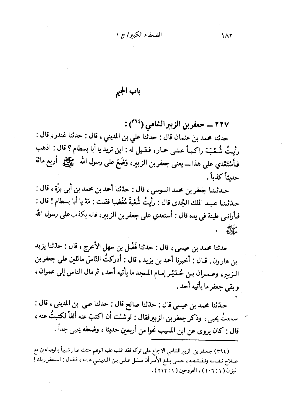 §227 - جَعْفَرُ بْنُ الزُّبَيْرِ الشَّامِيُّ حَدَّثَنَا مُحَمَّدُ بْنُ عُثْمَانَ قَالَ: حَدَّثَنَا عَلِيُّ بْنُ الْمَدِينِيُّ قَالَ: حَدَّثَنَا غُنْدَرٌ قَالَ: رَأَيْتُ شُعْبَةَ رَاكِبًا عَلَى حِمَارٍ فَقِيلَ لَهُ: أَيْنَ تُرِيدُ يَا أَبَا بِسْطَامٍ؟ قَالَ: أَذْهَبُ فَأَسْتَعْدِيَ عَلَى هَذَا يَعْنِي جَعْفَرَ بْنَ الزُّبَيْرِ، وَضَعَ عَلَى رَسُولِ اللَّهِ صَلَّى اللهُ عَلَيْهِ وَسَلَّمَ أَرْبَعَمِائَةِ حَدِيثًا كَذِبًا. حَدَّثَنَا جَعْفَرُ بْنُ مُحَمَّدِ السُّوسِيُّ قَالَ: حَدَّثَنَا أَحْمَدُ بْنُ مُحَمَّدِ بْنِ أَبِي بَزَّةَ قَالَ: حَدَّثَنَا عَبْدُ الْمَلِكِ الْجُدِّيُّ قَالَ: رَأَيْتُ شُعْبَةَ مُغْضَبًا فَقُلْتُ: مَهْ يَا أَبَا بِسْطَامٍ، قَالَ: فَأَرَانِي طِينَةً فِي يَدِهِ قَالَ: أَسْتَعْدِي عَلَى جَعْفَرِ بْنِ الزُّبَيْرِ فَإِنَّهُ يَكْذِبُ عَلَى رَسُولِ اللَّهِ صَلَّى اللهُ عَلَيْهِ وَسَلَّمَ. حَدَّثَنَا مُحَمَّدُ بْنُ عِيسَى قَالَ: حَدَّثَنَا فُضَيْلُ بْنُ سَهْلٍ الْأَعْرَجُ قَالَ: حَدَّثَنَا يَزِيدُ بْنُ هَارُونَ قَالَ: أَخْبَرَنَا أَحْمَدُ بْنُ زَيْدٍ قَالَ: أَدْرَكْتُ النَّاسَ مَائِلِينَ عَلَى جَعْفَرِ بْنِ الزُّبَيْرِ، وَعِمْرَانَ بْنِ حُدَيْرٍ إِمَامِ الْمَسْجِدِ مَا يَأْتِيهِ أَحَدٌ ثُمَّ مَالَ النَّاسُ إِلَى عِمْرَانَ وَبَقِيَ جَعْفَرٌ مَا يَأْتِيهِ أَحَدٌ. حَدَّثَنَا مُحَمَّدُ بْنُ عِيسَى قَالَ: حَدَّثَنَا صَالِحٌ قَالَ: حَدَّثَنَا عَلِيُّ بْنُ الْمَدِينِيُّ قَالَ: سَمِعْتُ يَحْيَى وَذَكَرَ جَعْفَرَ بْنَ الزُّبَيْرِ فَقَالَ: لَوْ شِئْتُ أَنْ أَكْتُبَ عَنْهُ أَلْفًا لَكَتَبْتُ عَنْهُ قَالَ: كَانَ يَرْوِي عَنِ ابْنِ الْمُسَيَّبِ نَحْوًا مِنْ أَرْبَعِينَ حَدِيثًا وَضَعَّفَهُ يَحْيَى جِدًّا. حَدَّثَنَا زَكَرِيَّا بْنُ يَحْيَى قَالَ: حَدَّثَنَا مُحَمَّدُ بْنُ الْمُثَنَّى قَالَ: مَا سَمِعْتُ عَبْدَ الرَّحْمَنِ وَلَا يَحْيَى حَدَّثَنَا عَنْ جَعْفَرِ بْنِ الزُّبَيْرِ قَطُّ. حَدَّثَنَا عَبْدُ اللَّهِ بْنُ أَحْمَدَ قَالَ: قَرَأَ عَلَيَّ أَبِي حَدِيثَ عَبَّادِ بْنِ عَبَّادٍ فَلَمَّا انْتَهَى إِلَى حَدِيثِ جَعْفَرِ بْنِ الزُّبَيْرِ قَالَ: اضْرِبْ عَلَى حَدِيثِ جَعْفَرِ بْنِ الزُّبَيْرِ. حَدَّثَنَا مُحَمَّدُ بْنُ عِيسَى قَالَ: حَدَّثَنَا عَبَّاسٌ قَالَ: سَمِعْتُ يَحْيَى بْنَ مَعِينٍ يَقُولُ: جَعْفَرُ بْنُ الزُّبَيْرِ ضَعِيفٌ، وَفَى مَوْضِعٍ آخَرَ لَيْسَ بِثِقَةٍ