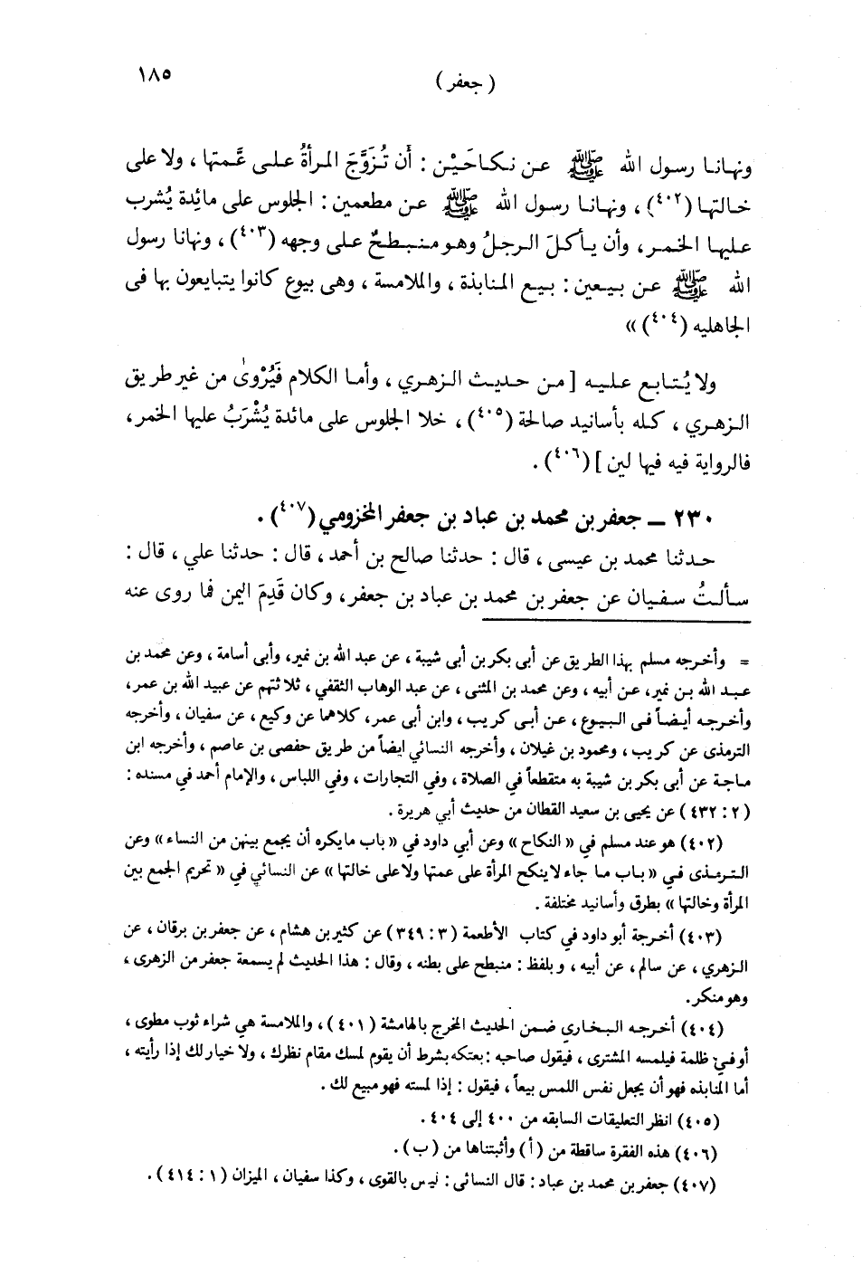§230 - جَعْفَرُ بْنُ مُحَمَّدِ بْنِ عَبَّادِ بْنِ جَعْفَرٍ الْمَخْزُومِيُّ حَدَّثَنَا مُحَمَّدُ بْنُ عِيسَى قَالَ: حَدَّثَنَا صَالِحُ بْنُ أَحْمَدَ قَالَ: حَدَّثَنَا عَلِيٌّ قَالَ: سَأَلْتُ سُفْيَانَ عَنْ جَعْفَرِ بْنِ مُحَمَّدِ بْنِ عَبَّادِ بْنِ جَعْفَرٍ وَكَانَ قَدِمَ الْيَمَنَ فَمَا رُوِيَ عَنْهُ شَيْءٌ، فَقُلْتُ لِسُفْيَانَ: رَوَى عَنْهُ مَعْمَرٌ أَحَادِيثَ يَحْيَى بْنِ سَعِيدٍ فَقَالَ سُفْيَانُ: إِنَّمَا وَجَدْنَا ذَاكَ كُتُبًا، وَلَمْ يَكُنْ صَاحِبَ حَدِيثٍ، أَنَا أَعْرَفُ بِهِ مِنْهُمْ، إِنَّمَا جَمَعَ كُتُبًا فَذَهَبَ بِهَا