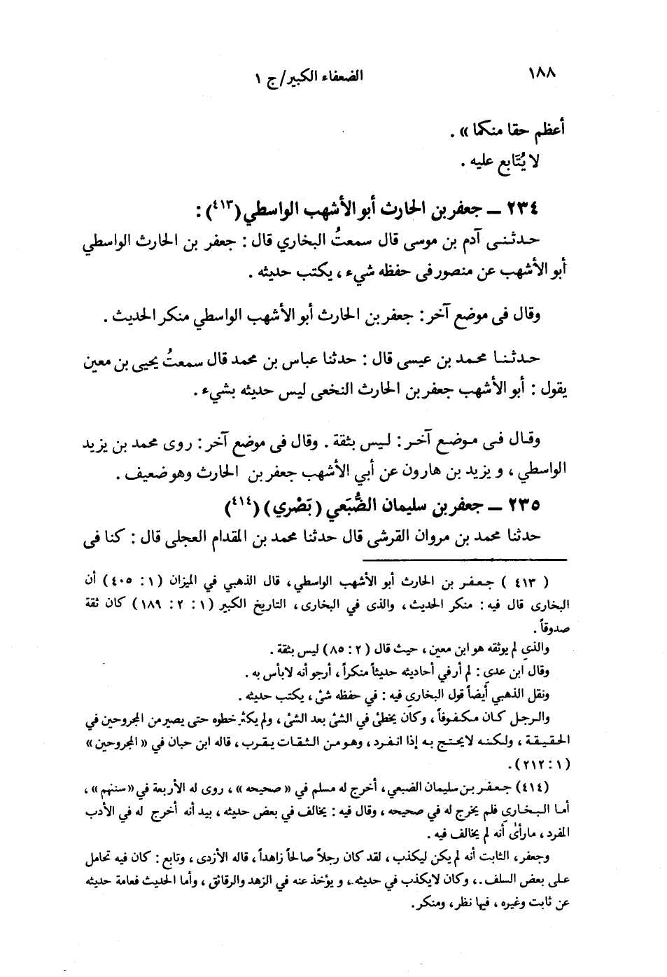 §234 - جَعْفَرُ بْنُ الْحَارِثِ أَبُو الْأَشْهَبِ الْوَاسِطِيُّ حَدَّثَنِي آدَمُ بْنُ مُوسَى قَالَ: سَمِعْتُ الْبُخَارِيَّ قَالَ: جَعْفَرُ بْنُ الْحَارِثِ الْوَاسِطِيُّ أَبُو الْأَشْهَبِ عَنْ مَنْصُورٍ فِي حِفْظِهِ شَيْءٌ يُكْتَبُ حَدِيثُهُ. وَقَالَ عَنْهُ فِي مَوْضِعٍ آخَرَ: جَعْفَرُ بْنُ الْحَارِثِ أَبُو الْأَشْهَبِ الْوَاسِطِيُّ مُنْكَرُ الْحَدِيثِ. حَدَّثَنَا مُحَمَّدُ بْنُ عِيسَى قَالَ: حَدَّثَنَا عَبَّاسُ بْنُ مُحَمَّدٍ قَالَ: سَمِعْتُ يَحْيَى بْنَ مَعِينٍ يَقُولُ: أَبُو الْأَشْهَبِ جَعْفَرُ بْنُ الْحَارِثِ النَّخَعِيُّ لَيْسَ حَدِيثُهُ بِشَيْءٍ، وَقَالَ فِي مَوْضِعٍ آخَرَ: لَيْسَ بِثِقَةٍ، وَقَالَ فِي مَوْضِعٍ آخَرَ: رَوَى مُحَمَّدُ بْنُ يَزِيدَ الْوَاسِطِيُّ وَيَزِيدُ بْنُ هَارُونَ عَنْ أَبِي الْأَشْهَبِ جَعْفَرِ بْنِ الْحَارِثِ وَهُوَ ضَعِيفٌ