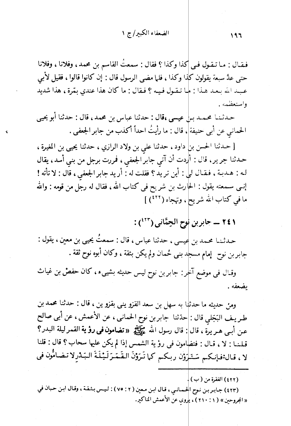 §241 - جَابِرُ بْنُ نُوحٍ الْحِمَّانِيُّ حَدَّثَنَا مُحَمَّدُ بْنُ عِيسَى قَالَ: حَدَّثَنَا عَبَّاسٌ قَالَ: سَمِعْتُ يَحْيَى بْنَ مَعِينٍ يَقُولُ: جَابِرُ بْنُ نُوحٍ إِمَامُ مَسْجِدِ بَنِي حِمَّانَ وَلَمْ يَكُنْ بِثِقَةٍ وَكَانَ أَبُوهُ نُوحٌ ثِقَةٌ، وَقَالَ فِي مَوْضِعٍ آخَرَ: جَابِرُ بْنُ نُوحٍ لَيْسَ حَدِيثُهُ بِشَيْءٍ، كَانَ حَفْصُ بْنُ غِيَاثٍ يُضَعِّفُهُ
