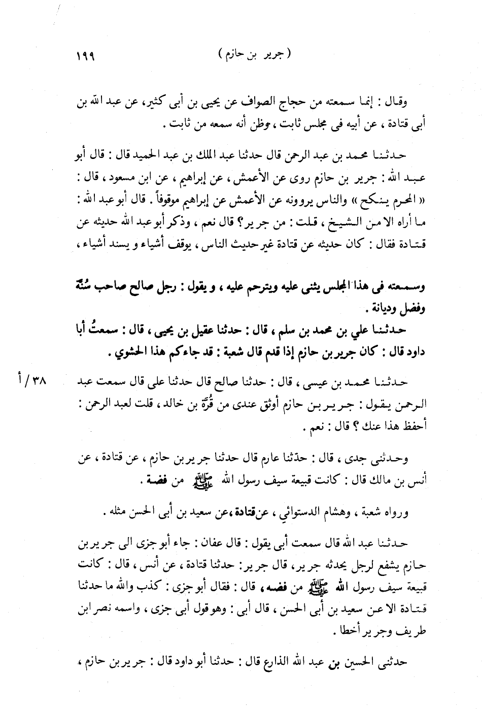 حَدَّثَنَا عَبْدُ اللَّهِ قَالَ: سَمِعْتُ أَبِي يَقُولُ: قَالَ عَفَّانُ: جَاءَ أَبُو جُزَيٍّ إِلَى جَرِيرِ بْنِ حَازِمٍ يَشْفَعُ لِرَجُلٍ يُحَدِّثُهُ جَرِيرٌ، قَالَ جَرِيرٌ: حَدَّثَنَا قَتَادَةُ عَنْ أَنَسِ قَالَ: §«كَانَتْ قَبْضَةُ سَيْفِ رَسُولِ اللَّهِ صَلَّى اللهُ عَلَيْهِ وَسَلَّمَ مِنْ فِضَّةٍ» فَقَالَ أَبُو جُزَيٍّ كَذَبَ وَاللَّهِ، مَا حَدَّثَنَا قَتَادَةُ إِلَّا عَنْ سَعِيدِ بْنِ أَبِي الْحَسَنِ. قَالَ أَبِي: وَهُوَ قَوْلُ أَبِي جُزَيٍّ وَاسْمُهُ نَصْرُ بْنُ طَرِيفٍ، وَجَرِيرٍ أَخْطَأَ. حَدَّثَنِي الْحُسَيْنُ بْنُ عَبْدِ اللَّهِ الذَّارِعُ قَالَ: حَدَّثَنَا أَبُو دَاوُدَ قَالَ: جَرِيرُ بْنُ حَازِمٍ، وَعَبْدُ الْوَهَّابِ الثَّقَفِيُّ تَغَيَّرَا فَحُجِبَ النَّاسُ عَنْهُمَا. قَالَ: وَسَمِعْتُ الْحَسَنَ بْنَ عَلِيٍّ يَقُولُ: بَلَغَنِي أَنَّ عَبْدَ الرَّحْمَنِ بْنَ مَهْدِيٍّ دَخَلَ إِلَى جَرِيرٍ يَعُودُهُ فِي اخْتِلَاطِهِ فَقَالَ: مَنْ أَنْتَ؟ فَقَالَ: عَبْدُ الرَّحْمَنِ بْنُ مَهْدِيٍّ، فَقَالَ: ابْنُ مَهْدِيِّ بْنِ مَيْمُونٍ. حَدَّثَنَا عَبْدُ اللَّهِ قَالَ: حَدَّثَنِي أَبِي، قَالَ: حَدَّثَنَا عَفَّانُ وَحَدَّثَنَا مُحَمَّدُ بْنُ إِسْمَاعِيلَ قَالَ: حَدَّثَنَا الْحَسَنُ بْنُ عَلِيٍّ قَالَ: حَدَّثَنَا عَفَّانُ حَدَّثَنَا جَرِيرُ بْنُ حَازِمٍ قَالَ: سَمِعْتُ أَبَا فَرْوَةَ قَالَ: أَخْبَرَنِي جَارٌ لِي أَنَّهُ خَاصَمَ إِلَى شُرَيْحٍ نَصْرَانِيًّا فِي شُفْعَةٍ فَقَضَى لِلنَّصْرَانِيِّ، فَقَالَ عَفَّانُ: حَدَّثَنِي غَيْرُ وَاحِدٍ عَنِ الْأَغْضَفِ قَالَ: سَأَلْتُ جَرِيرًا عَنْ حَدِيثِ أَبِي فَرْوَةَ فَقَالَ: حَدَّثَنِيهِ الْحَسَنُ بْنُ عُمَارَةَ