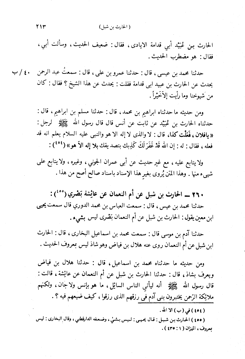 §260 - الْحَارِثُ بْنُ شِبْلٍ عَنْ أُمِّ النُّعْمَانِ عَنْ عَائِشَةَ بَصْرِيٌّ حَدَّثَنَا مُحَمَّدُ بْنُ عِيسَى قَالَ: سَمِعْتُ الْعَبَّاسَ بْنَ مُحَمَّدٍ الدُّورِيَّ قَالَ: سَمِعْتُ يَحْيَى بْنَ مَعِينٍ يَقُولُ: الْحَارِثُ بْنُ شِبْلٍ عَنْ أُمِّ النُّعْمَانِ، بَصْرِيٌّ لَيْسَ بِشَيْءٍ. حَدَّثَنَا آدَمُ بْنُ مُوسَى قَالَ: سَمِعْتُ مُحَمَّدَ بْنَ إِسْمَاعِيلَ الْبُخَارِيَّ قَالَ: الْحَارِثُ بْنُ شِبْلٍ عَنْ أُمِّ النُّعْمَانِ، رَوَى عَنْهُ هِلَالُ بْنُ فَيَّاضٍ، وَهُوَ شَاذٌّ لَيْسَ بِمَعْرُوفِ الْحَدِيثِ