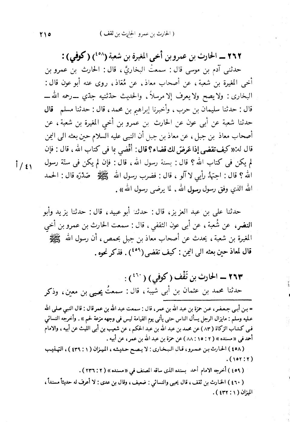 §262 - الْحَارِثُ بْنُ عَمْرٍو ابْنُ أَخِي الْمُغِيرَةِ بْنِ شُعْبَةَ كُوفِيٌّ حَدَّثَنِي آدَمُ بْنُ مُوسَى قَالَ: سَمِعْتُ الْبُخَارِيَّ قَالَ: الْحَارِثُ بْنُ عَمْرٍو ابْنُ أَخِي الْمُغِيرَةِ بْنِ شُعْبَةَ عَنْ أَصْحَابِ مُعَاذٍ، عَنْ مُعَاذٍ رَوَى عَنْهُ أَبُو عَوْنٍ قَالَ الْبُخَارِيُّ: وَلَا يَصِحُّ وَلَا يُعْرَفُ إِلَّا مُرْسَلًا