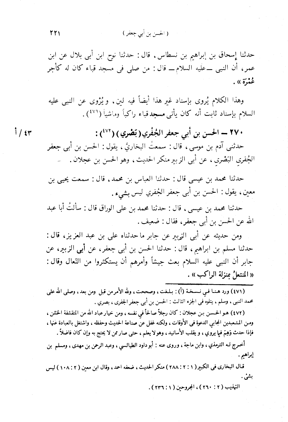 §270 - الْحَسَنُ بْنُ أَبِي جَعْفَرٍ الْجُفْرِيُّ بَصْرِيٌّ حَدَّثَنِي آدَمُ بْنُ مُوسَى قَالَ: سَمِعْتُ الْبُخَارِيَّ يَقُولُ: الْحَسَنُ بْنُ أَبِي جَعْفَرٍ الْجُفْرِيُّ الْبَصْرِيُّ عَنْ أَبِي الزُّبَيْرِ، مُنْكَرُ الْحَدِيثِ وَهُوَ الْحَسَنُ بْنُ عَجْلَانَ. حَدَّثَنَا مُحَمَّدُ بْنُ عِيسَى قَالَ: حَدَّثَنَا الْعَبَّاسُ بْنُ مُحَمَّدٍ قَالَ: سَمِعْتُ يَحْيَى بْنَ مَعِينٍ يَقُولُ: الْحَسَنُ بْنُ أَبِي جَعْفَرٍ الْجُفْرِيُّ لَيْسَ بِشَيْءٍ. حَدَّثَنَا مُحَمَّدُ بْنُ عِيسَى قَالَ: حَدَّثَنَا مُحَمَّدُ بْنُ عَلِيٍّ الْوَرَّاقُ قَالَ: سَأَلْتُ أَبَا عَبْدِ اللَّهِ عَنِ الْحَسَنِ بْنِ أَبِي جَعْفَرٍ فَقَالَ: ضَعِيفٌ