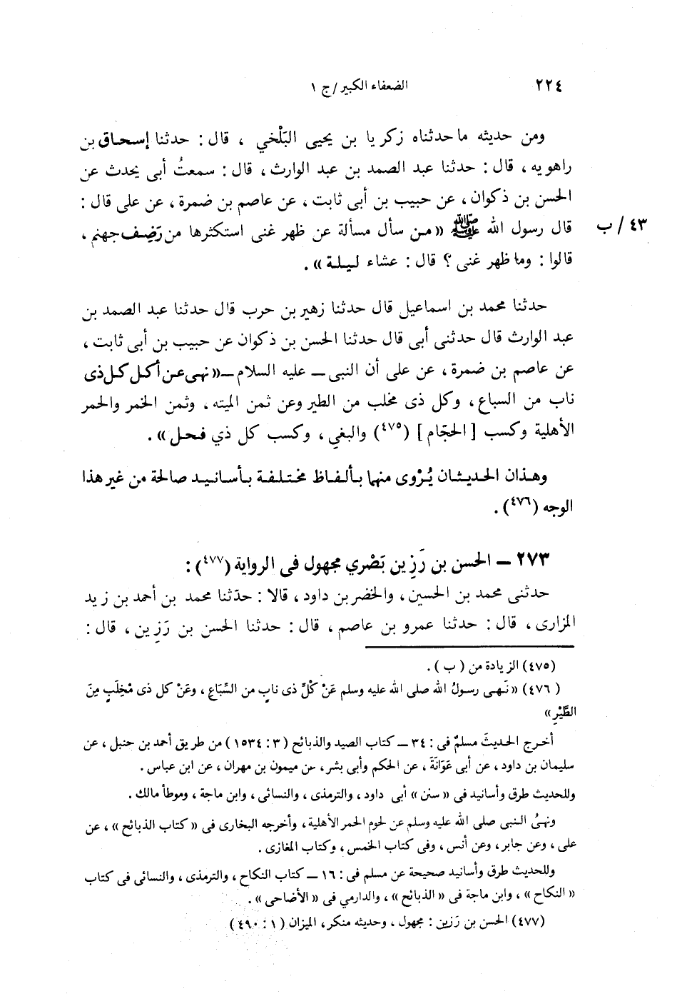 §273 - الْحَسَنُ بْنُ رَزِينٍ بَصْرِيٌّ مَجْهُولٌ فِي الرِّوَايَةِ مَجْهُولٌ بِالنَّقْلِ وَحَدِيثُهُ غَيْرُ مَحْفُوظٍ
