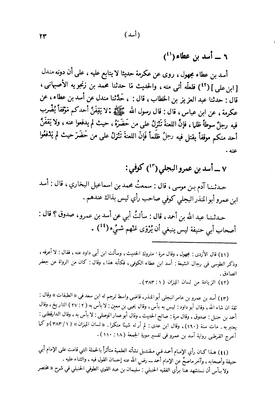 §6 - أَسَدُ بْنُ عَطَاءٍ أَسَدُ بْنُ عَطَاءٍ مَجْهُولٌ , رَوَى عَنْ عِكْرِمَةَ حَدِيثًا لَا يُتَابَعُ عَلَيْهِ , عَلَى أَنَّ دُونَهُ مِنْدَلٌ , فَلَعَلَّهُ أَتَى مِنْهُ , وَالْحَدِيثُ مَا حَدَّثَنَاهُ مُحَمَّدُ بْنُ زَنْجُوَيْهِ الْأَصْبَهَانِيُّ