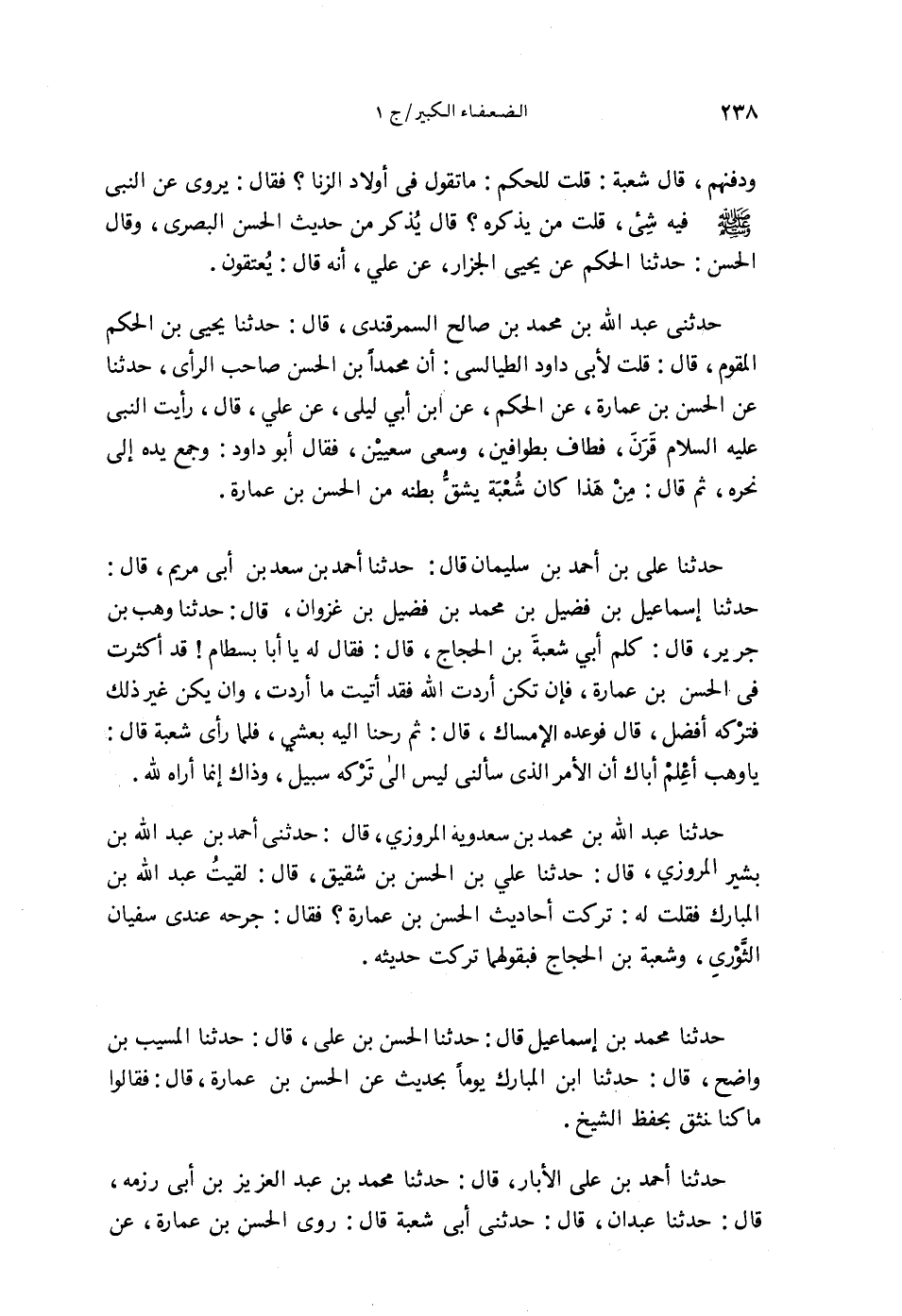 حَدَّثَنِي عَبْدُ اللَّهِ بْنُ مُحَمَّدِ بْنِ صَالِحٍ السَّمَرْقَنْدِيُّ قَالَ: حَدَّثَنَا يَحْيَى بْنُ الْحَكَمِ الْمُقَوِّمُ قَالَ: قُلْتُ لِأَبِي دَاوُدَ الطَّيَالِسِيِّ، أَنَّ مُحَمَّدًا بْنَ الْحَسَنِ صَاحِبَ الرَّأْي حَدَّثَنَا، عَنِ الْحَسَنِ بْنِ عُمَارَةَ عَنِ الْحَكَمِ عَنِ ابْنِ أَبِي لَيْلَى عَنْ عَلِيٍّ قَالَ: «رَأَيْتُ النَّبِيَّ عَلَيْهِ السَّلَامُ §قَرَنَ فَطَافَ بِطَوَافَيْنِ، وَسَعَى سَعْيَيْنِ» فَقَالَ أَبُو دَاوُدَ وَجَمَعَ يَدَهُ إِلَى نَحْرِهِ ثُمَّ قَالَ: مِنْ هَذَا كَانَ شُعْبَةُ يَشُقُّ بَطْنَهُ مِنَ الْحَسَنِ بْنِ عُمَارَةَ. حَدَّثَنَا عَلِيُّ بْنُ أَحْمَدَ بْنِ سُلَيْمَانَ قَالَ: حَدَّثَنَا أَحْمَدُ بْنُ سَعْدِ بْنِ أَبِي مَرْيَمَ قَالَ: حَدَّثَنَا إِسْمَاعِيلُ بْنُ فُضَيْلِ بْنِ مُحَمَّدِ بْنِ فُضَيْلِ بْنِ غَزْوَانَ قَالَ: حَدَّثَنَا وَهْبُ بْنُ جَرِيرٍ قَالَ: كَلَّمَ أَبِي شُعْبَةَ بْنَ الْحَجَّاجِ قَالَ: فَقَالَ لَهُ: يَا أَبَا بِسْطَامٍ، قَدْ أَكْثَرْتَ فِي الْحَسَنِ بْنِ عُمَارَةَ فَإِنْ تَكُنْ أَرَدْتَ اللَّهَ فَقَدْ أَتَيْتَ مَا أَرَدْتَ وَإِنْ يَكُنْ غَيْرَ ذَلِكَ فَتَرْكُهُ أَفْضَلُ، قَالَ: فَوَعَدَهُ الْإِمْسَاكَ قَالَ: ثُمَّ رُحْنَا إِلَيْهِ بِعَشِيٍّ فَلَمَّا رَآنِي شُعْبَةَ قَالَ: يَا وَهْبُ أَعْلِمْ أَبَاكَ أَنَّ الْأَمْرَ الَّذِي سَأَلَنِي لَيْسَ إِلَى تَرْكِهِ سَبِيلٌ، وَذَاكَ إِنَّمَا أَرَاهُ لِلَّهِ. حَدَّثَنَا عَبْدُ اللَّهِ بْنُ مُحَمَّدِ بْنِ سَعْدَوَيْهِ الْمَرْوَزِيُّ قَالَ: حَدَّثَنَا أَحْمَدُ بْنُ عَبْدِ اللَّهِ بْنِ بَشِيرٍ الْمَرْوَزِيُّ قَالَ: حَدَّثَنَا عَلِيُّ بْنُ الْحَسَنِ بْنِ شَقِيقٍ قَالَ: لَقِيتُ عَبْدَ اللَّهِ بْنِ الْمُبَارَكِ فَقُلْتُ لَهُ: تَرَكْتَ أَحَادِيثَ الْحَسَنِ بْنِ عُمَارَةَ؟ فَقَالَ: جَرَحَهُ عِنْدِي سُفْيَانُ الثَّوْرِيُّ، وَشُعْبَةُ بْنُ الْحَجَّاجِ، فَبِقَوْلِهِمَا تَرَكْتُ حَدِيثَهُ. حَدَّثَنَا مُحَمَّدُ بْنُ إِسْمَاعِيلَ قَالَ: حَدَّثَنَا الْحَسَنُ بْنُ عَلِيٍّ قَالَ: حَدَّثَنَا الْمُسَيَّبُ بْنُ وَاضِحٍ قَالَ: حَدَّثَنَا ابْنُ الْمُبَارَكِ يَوْمًا بِحَدِيثٍ عَنِ الْحَسَنِ بْنِ عُمَارَةَ قَالَ: فَقَالُوا مَا كُنَّا نَثِقُ بِحِفْظِ الشَّيْخِ. حَدَّثَنَا أَحْمَدُ بْنُ عَلِيٍّ الْأَبَّارُ قَالَ: حَدَّثَنَا مُحَمَّدُ بْنُ عَبْدِ الْعَزِيزِ بْنِ أَبِي رِزْمَةَ قَالَ: حَدَّثَنَا عَبْدَانُ قَالَ: حَدَّثَنِي أَبِي عَنْ شُعْبَةَ قَالَ: رَوَى الْحَسَنُ بْنُ عُمَارَةَ عَنِ -[239]- الْحَكَمِ عَنْ يَحْيَى بْنِ الْجَزَّارِ بِسَبْعِ أَحَادِيثَ، فَلَقِيتُ الْحَكَمَ فَسَأَلْتُهُ عَنْهَا فَقَالَ: مَا حَدَّثْتُ بِحَدِيثٍ مِنْهَا. حَدَّثَنَا أَحْمَدُ بْنُ عَلِيٍّ قَالَ: حَدَّثَنَا مُحَمَّدُ بْنُ عَبْدِ الْعَزِيزِ بْنِ أَبِي رِزْمَةَ قَالَ: حَدَّثَنِي أَبِي عَنْ عَبْدِ اللَّهِ بْنِ الْمُبَارَكِ عَنْ سُفْيَانَ بْنِ عُيَيْنَةَ قَالَ: كُنْتُ إِذَا سَمِعْتُ الْحَسَنَ بْنَ عُمَارَةَ يَرْوِي عَنِ الزُّهْرِيِّ جَعَلْتُ أُصْبُعِي فِي أُذُنِي. حَدَّثَنِي آدَمُ بْنُ مُوسَى قَالَ: حَدَّثَنَا مُحَمَّدُ بْنُ إِسْمَاعِيلَ قَالَ: حَدَّثَنِي عَبْدُ اللَّهِ بْنُ مُحَمَّدٍ قَالَ: قِيلَ لِابْنِ عُيَيْنَةَ: أَكَانَ الْحَسَنُ بْنُ عُمَارَةَ يَحْفَظُ؟ قَالَ: كَانَ لَهُ فَضْلٌ، وَغَيْرُهُ أَحْفَظُ مِنْهُ. حَدَّثَنَا عَبْدُ اللَّهِ بْنُ أَحْمَدَ بْنِ حَنْبَلٍ قَالَ: قَالَ أَبِي: كَانَ وَكِيعٌ إِذَا أَتَى عَلَى حَدِيثِ الْحَسَنِ بْنِ عُمَارَةَ قَالَ: اجْرِ عَلَيْهِ، يَعْنِي اضْرِبْ عَلَيْهِ. حَدَّثَنَا مُحَمَّدُ بْنُ سَعْدٍ الشَّاشِيُّ قَالَ: حَدَّثَنَا مُحَمَّدُ بْنُ عَمْرِو بْنِ الْعَبَّاسِ الْبَاهِلِيُّ قَالَ: سَمِعْتُ سُفْيَ