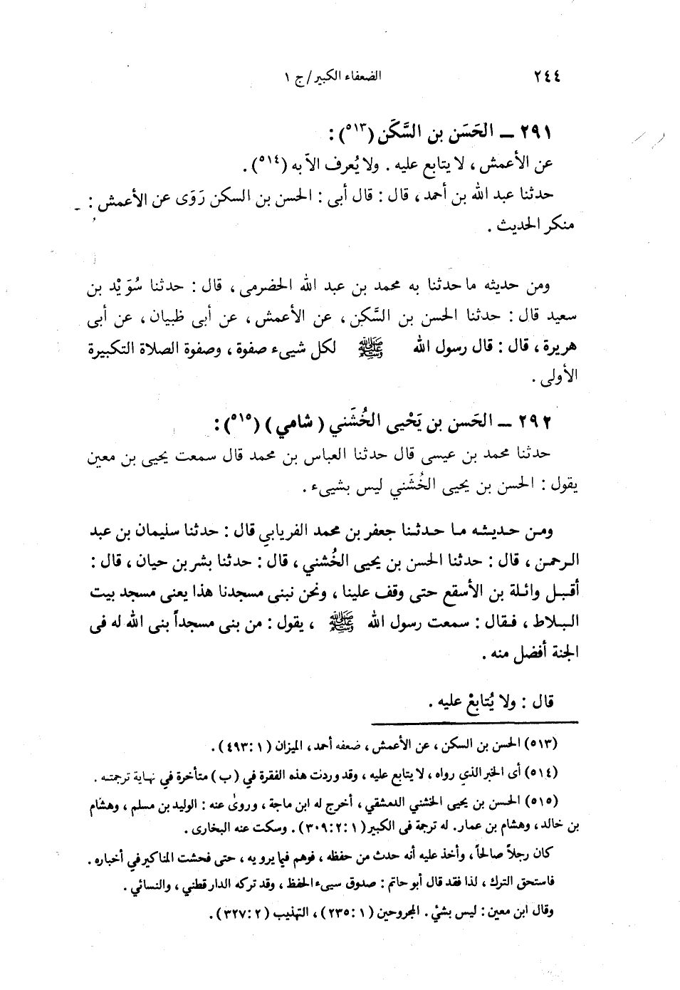§292 - الْحَسَنُ بْنُ يَحْيَى الْخُشَنِيُّ شَامِيٌّ حَدَّثَنَا مُحَمَّدُ بْنُ عِيسَى قَالَ: حَدَّثَنَا الْعَبَّاسُ بْنُ مُحَمَّدٍ قَالَ: سَمِعْتُ يَحْيَى بْنَ مَعِينٍ يَقُولُ: الْحَسَنُ بْنُ يَحْيَى الْخُشَنِيُّ لَيْسَ بِشَيْءٍ