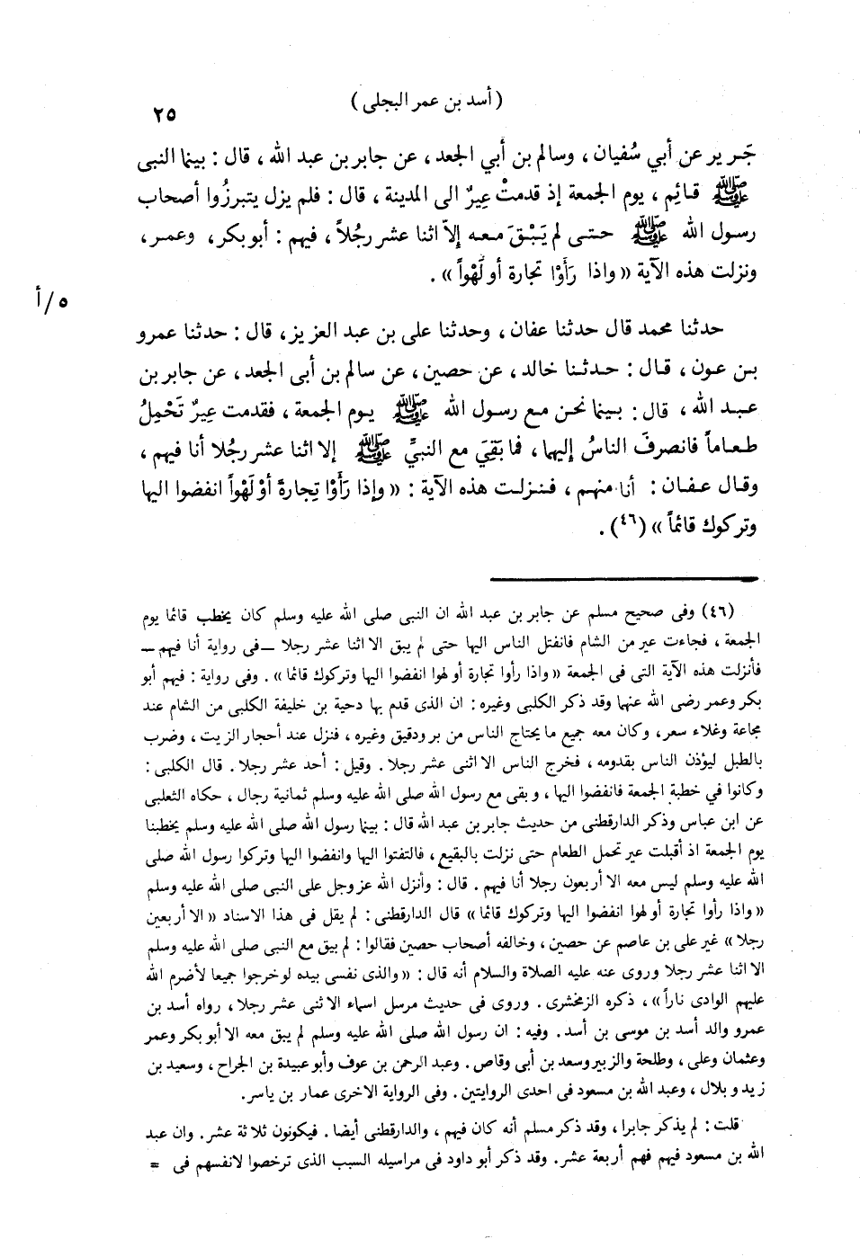 حَدَّثَنَا مُحَمَّدٌ , قَالَ: حَدَّثَنَا عَفَّانُ , وَحَدَّثَنَا عَلِيُّ بْنُ عَبْدِ الْعَزِيزِ , قَالَ: حَدَّثَنَا عَمْرُو بْنُ عَوْنٍ قَالَا: حَدَّثَنَا خَالِدٌ، عَنْ حُصَيْنٍ، عَنْ سَالِمِ بْنِ أَبِي الْجَعْدِ، عَنْ جَابِرِ بْنِ عَبْدِ اللَّهِ , قَالَ: " بَيْنَمَا نَحْنُ مَعَ رَسُولِ اللَّهِ صَلَّى اللهُ عَلَيْهِ وَسَلَّمَ يَوْمَ الْجُمُعَةِ , §فَقَدِمَتْ عِيرٌ تَحْمِلُ طَعَامًا , فَانْصَرَفَ النَّاسُ إِلَيْهِمَا، فَمَا بَقِيَ مَعَ النَّبِيِّ صَلَّى اللهُ عَلَيْهِ وَسَلَّمَ إِلَّا اثْنَا عَشَرَ رَجُلًا , أَنَا فِيهِمْ - وَقَالَ عَفَّانُ: أَنَا مِنْهُمْ - فَنَزَلَتْ هَذِهِ الْآيَةُ: {وَإِذَا رَأَوْا تِجَارَةً أَوْ لَهْوًا انْفَضُّوا إِلَيْهَا وَتَرَكُوكَ قَائِمًا} [الجمعة: 11] "