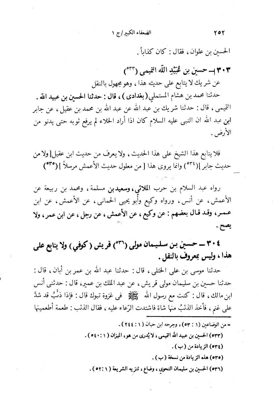 §304 - حُسَيْنُ بْنُ سُلَيْمَانَ مَوْلَى قُرَيْشٍ، كُوفِيٌّ، مَجْهُولٌ، لَا يُتَابَعُ عَلَى حَدِيثِهِ هَذَا وَلَيْسَ بِمَعْرُوفٍ وَلَا يُعْرَفُ بِالنَّقْلِ