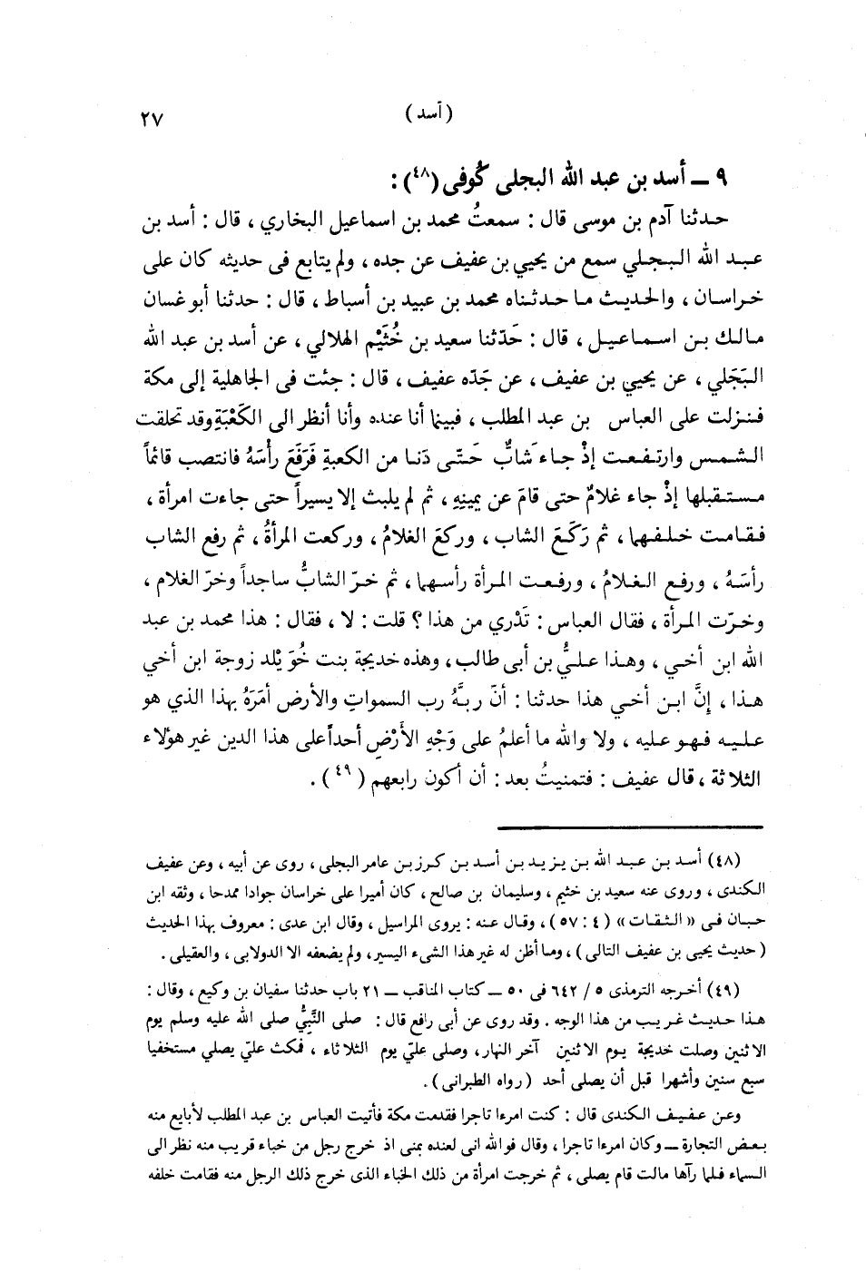 §9 - أَسَدُ بْنُ عَبْدِ اللَّهِ الْبَجَلِيُّ كُوفِيٌّ حَدَّثَنَا آدَمُ بْنُ مُوسَى قَالَ: سَمِعْتُ مُحَمَّدَ بْنَ إِسْمَاعِيلَ الْبُخَارِيَّ قَالَ: أَسَدُ بْنُ عَبْدِ اللَّهِ الْبَجَلِيُّ سَمِعَ مِنَ يَحْيَى بْنِ عَفِيفٍ عَنْ جَدِّهِ، وَلَمْ يُتَابَعْ فِي حَدِيثِهِ، كَانَ عَلَى خُرَاسَانَ