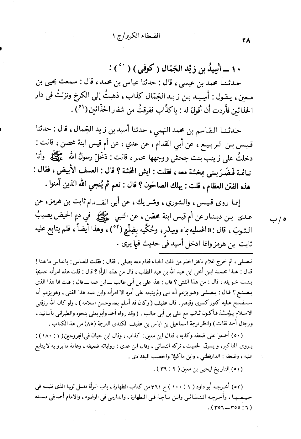 §10 - أَسِيدُ بْنُ زَيْدٍ الْجَمَّالُ كُوفِيٌّ حَدَّثَنَا مُحَمَّدُ بْنُ عِيسَى قَالَ: حَدَّثَنَا عَبَّاسُ بْنُ مُحَمَّدٍ، سَمِعْتُ يَحْيَى بْنَ مَعِينٍ يَقُولُ: أَسِيدُ بْنُ زَيْدٍ الْجَمَّالُ كَذَّابٌ , ذَهَبْتُ إِلَى الْكَرْخِ وَنَزَلَتُ فِي دَارِ الْحَذَّائِينَ فَأَرَدْتُ أَنْ أَقُولَ لَهُ: يَا كَذَّابُ فَغَرِقْتُ مِنْ شِغَارِ الْحَذَّائِينَ