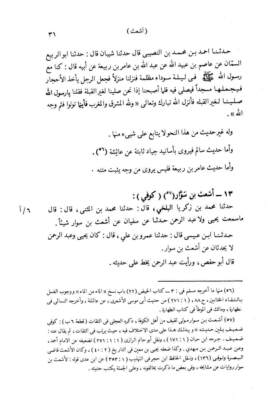 §13 - أَشْعَثُ بْنُ سَوَّارٍ كُوفِيٌّ حَدَّثَنَا مُحَمَّدُ بْنُ زَكَرِيَّا الْبَلْخِيُّ قَالَ: حَدَّثَنَا مُحَمَّدُ بْنُ الْمُثَنَّى قَالَ: قَالَ: مَا سَمِعْتُ يَحْيَى وَلَا عَبْدَ الرَّحْمَنِ حَدَّثَا عَنْ سُفْيَانَ عَنْ أَشْعَثَ بْنِ سَوَّارٍ شَيْئًا قَطُّ. حَدَّثَنَا ابْنُ عِيسَى قَالَ: حَدَّثَنَا عَمْرُو بْنُ عَلِيٍّ قَالَ: كَانَ يَحْيَى , وَعَبْدُ الرَّحْمَنِ لَا يُحَدِّثَانِ عَنْ أَشْعَثَ بْنِ سَوَّارٍ , قَالَ أَبُو حَفْصٍ: وَرَأَيْتُ عَبْدَ الرَّحْمَنِ يَخُطُّ عَلَى حَدِيثِهِ. حَدَّثَنَا عَبْدُ اللَّهِ بْنُ أَحْمَدَ قَالَ: حَدَّثَنَا عَبَّاسُ بْنُ مُحَمَّدٍ قَالَ: سَمِعْتُ يَحْيَى بْنَ مَعِينٍ , يَقُولُ: أَشْعَثُ بْنُ سَوَّارٍ ضَعِيفٌ. حَدَّثَنَا عَبْدُ اللَّهِ بْنُ أَحْمَدَ قَالَ: سَأَلْتُ أَبِي عَنْ أَشْعَثَ بْنِ سَوَّارٍ قَالَ: هُوَ أمِثْلُ مِنْ مُحَمَّدِ بْنِ سَالِمٍ وَلَكِنَّهُ عَلَى ذَاكَ، يَعْنِي: ضَعِيف. وَحَدَّثَنَا عَبْدُ اللَّهِ فِي مَوْضِعٍ آخَرَ , قَالَ: سَمِعْتُ أَبِي يَقُولُ: أَشْعَثُ بْنُ سَوَّارٍ ضَعِيفٌ. حَدَّثَنَا مُحَمَّدُ بْنُ عِيسَى قَالَ: حَدَّثَنَا صَالِحُ بْنُ أَحْمَدَ قَالَ: حَدَّثَنَا عَلِيٌّ قَالَ: سَمِعْتُ يَحْيَى يَقُولُ: حَجَّاجُ بْنُ أَرْطَاةَ , وَمُحَمَّدُ بْنُ إِسْحَاقَ عِنْدِي سَوَاءٌ , وَأَشْعَثُ بْنُ سَوَّارٍ دُونَهُمَا , وَيَحْيَى بْنُ أَبِي أُنَيْسَةَ أَحَبُّ إِلَيَّ مِنْ حَجَّاجٍ , وَأَشْعَثَ بْنِ سَوَّارٍ وَمُحَمَّدِ بْنِ إِسْحَاقَ