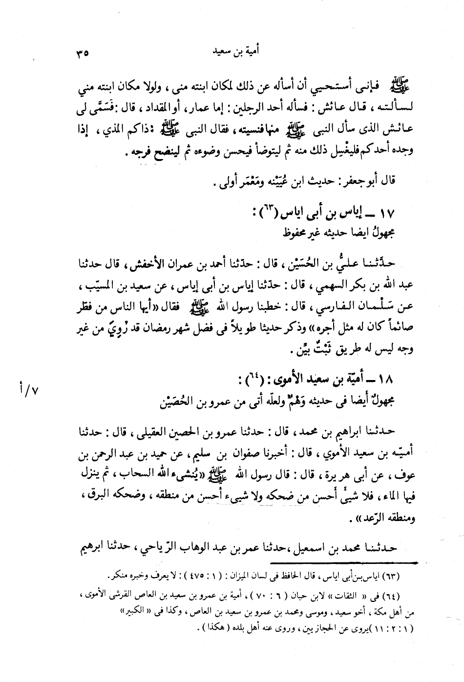 §18 - أُمَيَّةُ بْنُ سَعِيدٍ الْأُمَوِيُّ مَجْهُولٌ أَيْضًا , فِي حَدِيثِهِ وَهْمٌ، وَلَعَلَّهُ أُتِيَ مِنْ عَمْرِو بْنِ الْحُصَيْنِ