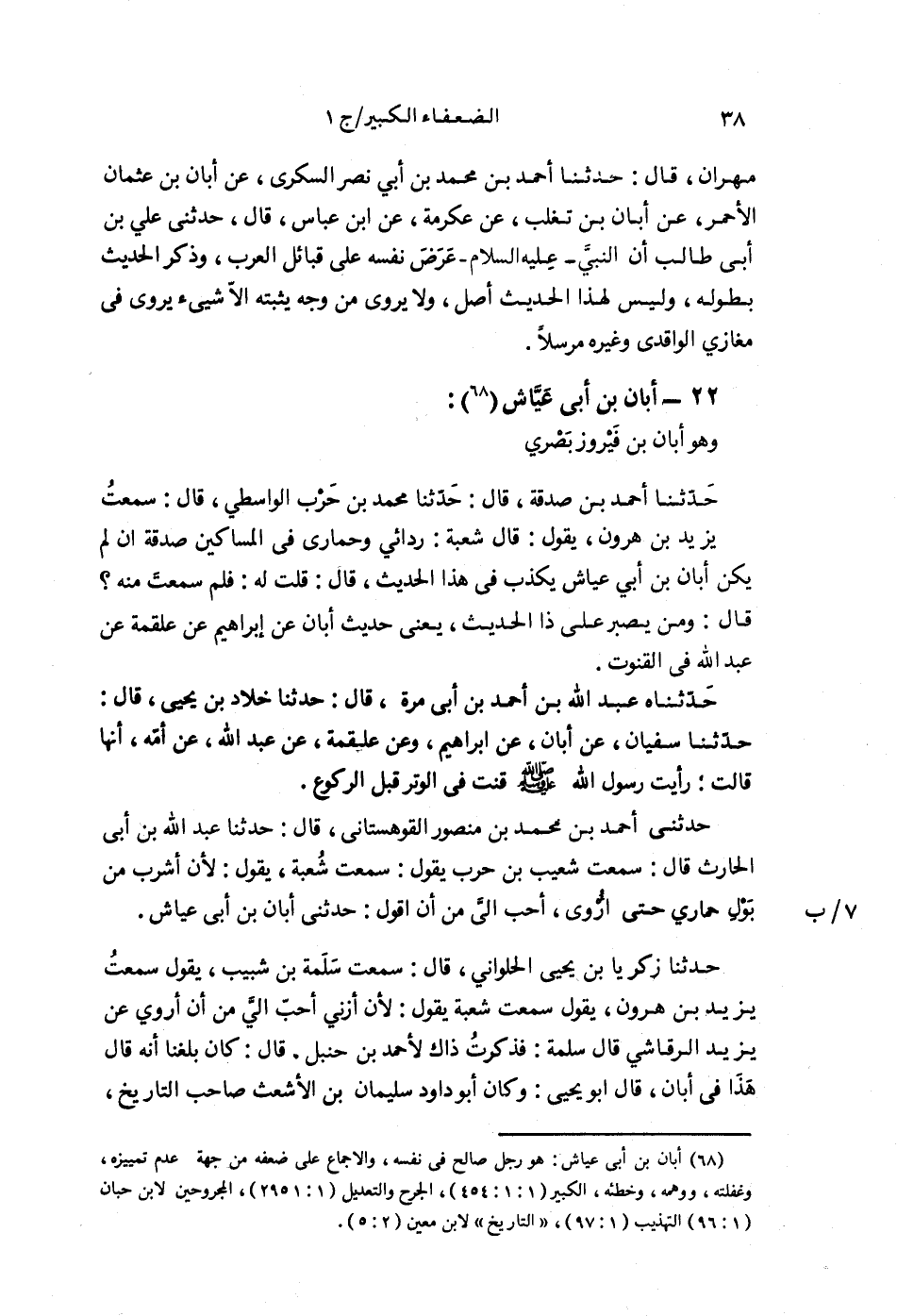 §22 - أَبَانُ بْنُ أَبِي عَيَّاشٍ , وَهُوَ أَبَانُ بْنُ فَيْرُوزَ بَصْرِيٌّ حَدَّثَنَا أَحْمَدُ بْنُ صَدَقَةَ قَالَ: حَدَّثَنَا مُحَمَّدُ بْنُ حَرْبٍ الْوَاسِطِيُّ قَالَ: سَمِعْتُ يَزِيدَ بْنِ هَارُونَ يَقُولُ: قَالَ شُعْبَةُ: رِدَائِي وَحِمَارِي فِي الْمَسَاكِينِ صَدَقَةٌ إِنْ لَمْ يَكُنْ أَبَانُ بْنُ أَبِي عَيَّاشٍ يَكْذِبُ فِي هَذَا الْحَدِيثِ قَالَ: قُلْتُ لَهُ: فَلِمَ سَمِعْتَ مِنْهُ؟ قَالَ: وَمَنْ يَصْبِرُ عَلَى ذَا الْحَدِيثِ، يَعْنِي حَدِيثَ أَبَانَ , عَنْ إِبْرَاهِيمَ عَنْ عَلْقَمَةَ , عَنْ عَبْدِ اللَّهِ فِي الْقُنُوتِ