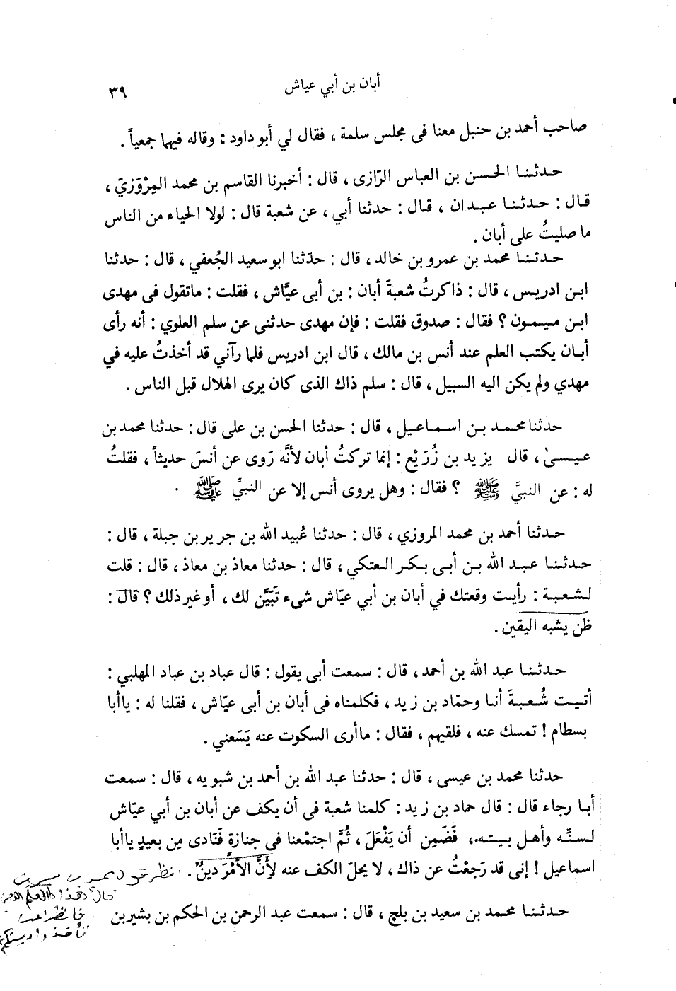 صَاحِبُ أَحْمَدَ بْنِ حَنْبَلٍ مَعَنَا فِي مَجْلِسِ سَلَمَةَ , فَقَالَ لِي أَبُو دَاوُدَ: وَقَالَهُ فِيهِمَا جَمِيعًا. حَدَّثَنَا الْحَسَنُ بْنُ الْعَبَّاسِ الرَّازِيُّ قَالَ: أَخْبَرَنَا الْقَاسِمُ بْنُ مُحَمَّدٍ الْمَرْوَزِيُّ , قَالَ: حَدَّثَنَا عَبْدَانُ قَالَ: حَدَّثَنَا أَبِي عَنْ شُعْبَةَ قَالَ: لَوْلَا الْحَيَاءُ مِنَ النَّاسِ مَا صَلَّيْتُ عَلَى أَبَانَ. حَدَّثَنَا مُحَمَّدُ بْنُ عَمْرِو بْنِ خَالِدٍ قَالَ: حَدَّثَنَا أَبُو سَعِيدٍ الْجُعْفِيُّ قَالَ: حَدَّثَنَا ابْنُ إِدْرِيسَ قَالَ: ذَاكَرْتُ شُعْبَةَ أَبَانَ بْنَ أَبِي عَيَّاشٍ , فَقُلْتُ: مَا تَقُولُ فِي مَهْدِيِّ بْنِ مَيْمُونٍ فَقَالَ: صَدُوقٌ. فَقُلْتُ: فَإِنَّ مَهْدِيًّ حَدَّثَنِي عَنْ سَلْمٍ الْعَلَوِيِّ أَنَّهُ رَأَى أَبَانَ يَكْتُبُ الْعِلْمَ عِنْدَ أَنَسِ بْنِ مَالِكٍ , قَالَ ابْنُ إِدْرِيسَ: فَلَمَّا رَآنِي قَدْ أَخَذْتُ عَلَيْهِ فِي مَهْدِيٍّ وَلَمْ يَكُنْ إِلَيْهِ سَبِيلٌ , قَالَ سَلْمٌ: ذَاكَ الَّذِي كَانَ يَرَى الْهِلَالَ قَبْلَ النَّاسِ. حَدَّثَنَا مُحَمَّدُ بْنُ إِسْمَاعِيلَ قَالَ: حَدَّثَنَا الْحَسَنُ بْنُ عَلِيٍّ قَالَ: حَدَّثَنَا مُحَمَّدُ بْنُ عِيسَى، قَالَ يَزِيدُ بْنُ زُرَيْعٍ: إِنَّمَا تَرَكْتُ أَبَانَ لِأَنَّهُ رَوَى عَنْ أَنَسٍ حَدِيثًا , فَقُلْتُ لَهُ: عَنِ النَّبِيِّ صَلَّى اللهُ عَلَيْهِ وَسَلَّمَ؟ فَقَالَ: وَهَلْ يَرْوِي أَنَسٌ إِلَّا عَنِ النَّبِيِّ صَلَّى اللهُ عَلَيْهِ وَسَلَّمَ. حَدَّثَنَا أَحْمَدُ بْنُ مُحَمَّدٍ الْمَرْوَزِيُّ قَالَ: حَدَّثَنَا عُبَيْدُ اللَّهِ بْنُ جَرِيرِ بْنِ جَبَلَةَ قَالَ: حَدَّثَنَا عَبْدُ اللَّهِ بْنُ أَبِي بَكْرٍ الْعَتَكِيُّ قَالَ: حَدَّثَنَا مُعَاذُ بْنُ مُعَاذٍ قَالَ: قُلْتُ لِشُعْبَةَ: رَأَيْتُ وَقْعَتَكَ فِي أَبَانَ بْنِ أَبِي عَيَّاشٍ شَيْءٌ تَبَيَّنَ لَكَ أَوْ غَيْرَ ذَلِكَ؟ قَالَ: ظَنٌّ يُشْبِهُ الْيَقِينَ. حَدَّثَنَا عَبْدُ اللَّهِ بْنُ أَحْمَدَ قَالَ: سَمِعْتُ أَبِي يَقُولُ: قَالَ عَبَّادُ بْنُ عَبَّادٍ الْمُهَلَّبِيُّ: أَتَيْتُ شُعْبَةَ أَنَا وَحَمَّادُ بْنُ زَيْدٍ فَكَلَّمْنَاهُ فِي أَبَانَ بْنِ أَبِي عَيَّاشٍ , فَقُلْنَا لَهُ: يَا أَبَا بِسْطَامٍ تُمْسِكُ عَنْهُ فَلَقِيَهُمْ , فَقَالَ: مَا أَرَى السُّكُوتَ عَنْهُ يَسَعُنِي. حَدَّثَنَا مُحَمَّدُ بْنُ عِيسَى قَالَ: حَدَّثَنَا عَبْدُ اللَّهِ بْنُ أَحْمَدَ بْنِ شَبُّوَيْهِ قَالَ: سَمِعْتُ أَبَا رَجَاءٍ قَالَ: قَالَ حَمَّادُ بْنُ زَيْدٍ: كَلَّمْنَا شُعْبَةَ فِي أَنْ يَكُفَّ عَنْ أَبَانَ بْنِ أَبِي عَيَّاشٍ لِسِنِّهِ وَأَهْلِ بَيْتِهِ، فَضَمِنَ أَنْ يَفْعَلَ , ثُمَّ اجْتَمَعْنَا فِي جِنَازَةٍ فَنَادَى مِنْ بَعِيدٍ يَا أَبَا إِسْمَاعِيلَ إِنِّي قَدْ رَجَعْتُ عَنْ ذَاكَ، لَا يَحِلُّ الْكَفُّ عَنْهُ؛ لِأَنَّ الْأَمْرَ دِينٌ. حَدَّثَنَا مُحَمَّدُ بْنُ سَعِيدِ بْنِ بَلْجِ قَالَ: سَمِعْتُ عَبْدَ الرَّحْمَنِ بْنَ الْحَكَمِ بْنِ بَشِيرِ بْنِ