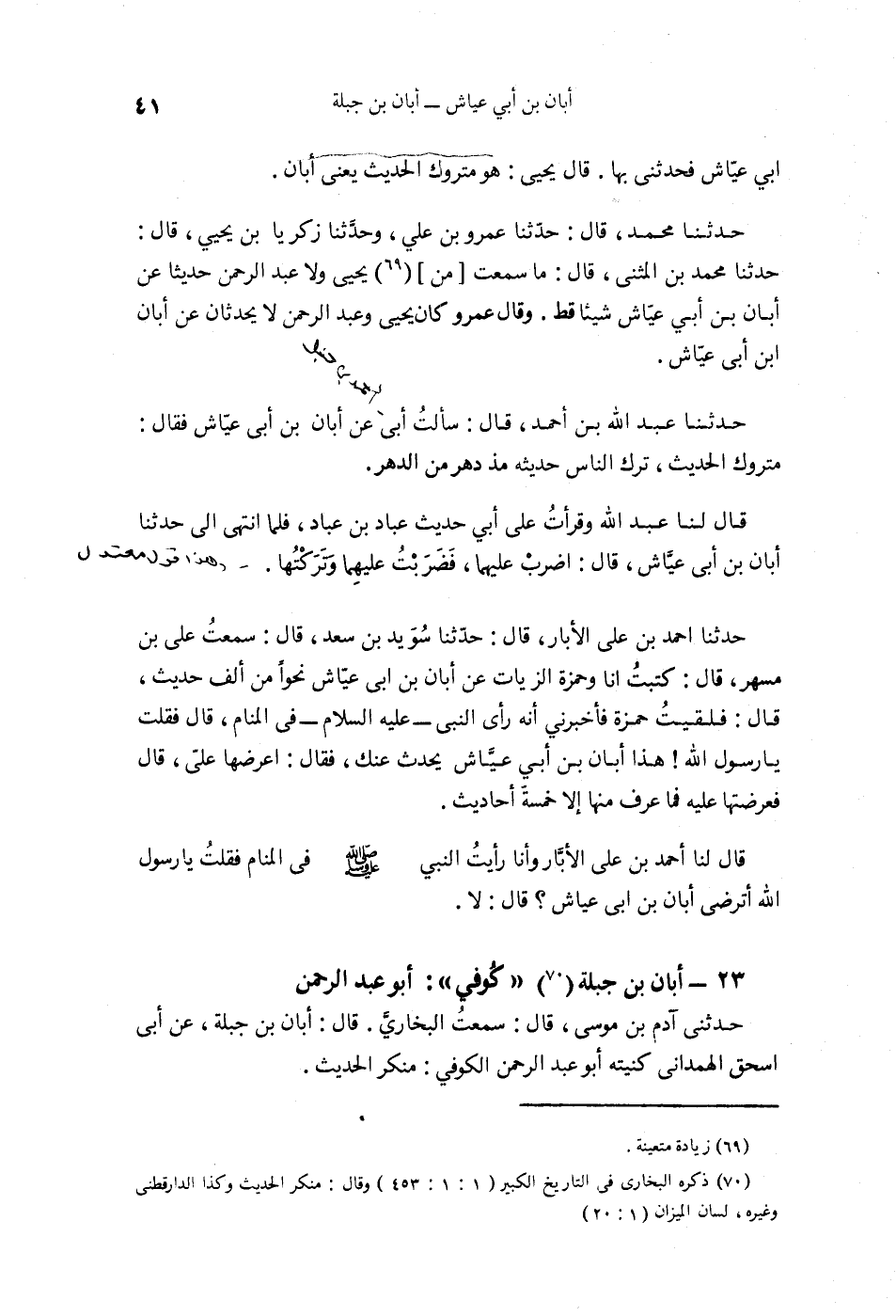 §23 - أَبَانُ بْنُ جَبَلَةَ، كُوفِيٌّ، أَبُو عَبْدِ الرَّحْمَنِ حَدَّثَنِي آدَمُ بْنُ مُوسَى قَالَ: سَمِعْتُ الْبُخَارِيَّ قَالَ: أَبَانُ بْنُ جَبَلَةَ عَنْ أَبِي إِسْحَاقَ الْهَمْدَانِيِّ، كُنْيَتُهُ أَبُو عَبْدِ الرَّحْمَنِ الْكُوفِيُّ مُنْكَرُ الْحَدِيثِ