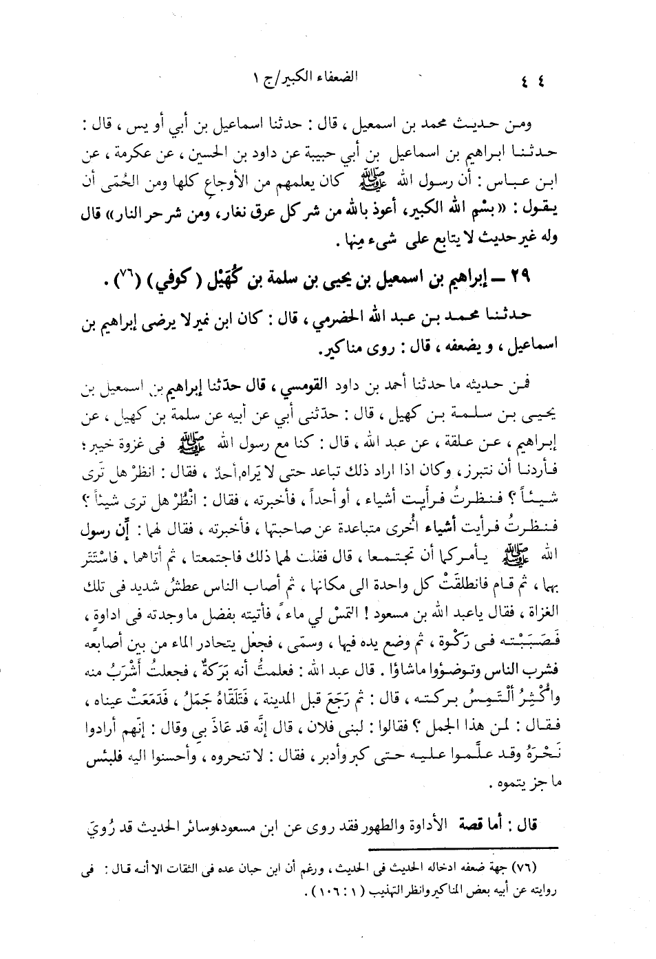 §29 - إِبْرَاهِيمُ بْنُ إِسْمَاعِيلَ بْنِ يَحْيَى بْنِ سَلَمَةَ بْنِ كُهَيْلٍ كُوفِيٌّ حَدَّثَنَا مُحَمَّدُ بْنُ عَبْدِ اللَّهِ الْحَضْرَمِيُّ قَالَ: كَانَ ابْنُ نُمَيْرٍ لَا يَرْضَى إِبْرَاهِيمَ بْنَ إِسْمَاعِيلَ وَيُضَعِّفُهُ , قَالَ: رَوَى مَنَاكِيرَ