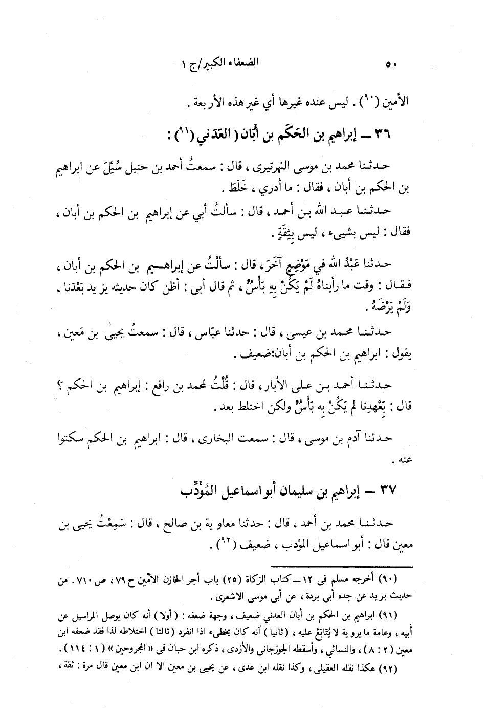 §36 - إِبْرَاهِيمُ بْنُ الْحَكَمِ بْنِ أَبَانَ الْعَدَنِيُّ حَدَّثَنَا مُحَمَّدُ بْنُ مُوسَى النَّهْرَتِيرِيُّ قَالَ: سَمِعْتُ أَحْمَدَ بْنَ حَنْبَلٍ سُئِلَ عَنْ إِبْرَاهِيمَ بْنِ الْحَكَمِ بْنِ أَبَانَ فَقَالَ: مَا أَدْرِي , خَلَطَ. حَدَّثَنَا عَبْدُ اللَّهِ بْنُ أَحْمَدَ قَالَ: سَأَلْتُ أَبِي عَنْ إِبْرَاهِيمَ بْنِ الْحَكَمِ بْنِ أَبَانَ فَقَالَ: لَيْسَ بِشَيْءٍ , لَيْسَ بِثِقَةٍ. حَدَّثَنَا عَبْدُ اللَّهِ فِي مَوْضِعٍ آخَرَ , قَالَ: سَأَلْتُ أَبِي عَنْ إِبْرَاهِيمَ بْنِ الْحَكَمِ بْنِ أَبَانَ , فَقَالَ: وَقْتَ مَا رَأَيْنَاهُ لَمْ يَكُنْ بِهِ بَأْسٌ , ثُمَّ قَالَ أَبِي: أَظُنُّهُ كَانَ حَدِيثُهُ يَزِيدُ بَعْدَنَا , وَلَمْ يَرْضَهُ. حَدَّثَنَا مُحَمَّدُ بْنُ عِيسَى قَالَ: حَدَّثَنَا عَبَّاسٌ قَالَ: سَمِعْتُ يَحْيَى بْنَ مَعِينٍ يَقُولُ: إِبْرَاهِيمُ بْنُ الْحَكَمِ بْنِ أَبَانَ: ضَعِيفٌ. حَدَّثَنَا أَحْمَدُ بْنُ عَلِيٍّ الْأَبَّارُ قَالَ: قُلْتُ لِمُحَمَّدِ بْنِ رَافِعٍ: إِبْرَاهِيمُ بْنُ الْحَكَمِ؟ قَالَ: بِعَهْدِنَا لَمْ يَكُنْ بِهِ بَأْسٌ , وَلَكِنِ اخْتَلَطَ بَعْدُ. حَدَّثَنَا آدَمُ بْنُ مُوسَى قَالَ: سَمِعْتُ الْبُخَارِيَّ قَالَ: إِبْرَاهِيمُ بْنُ الْحَكَمِ سَكَتُوا عَنْهُ