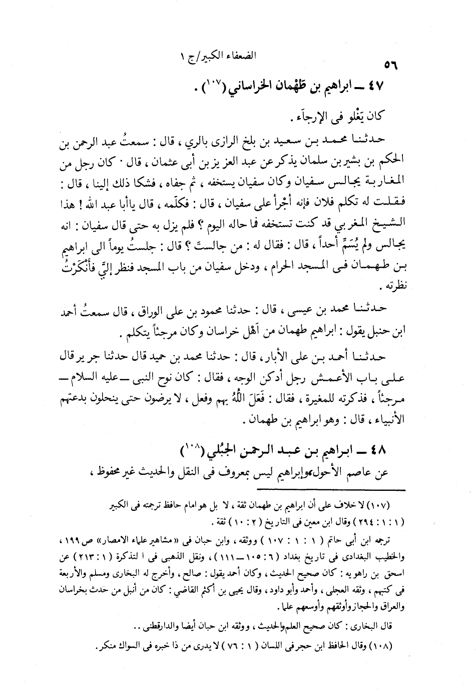 §47 - إِبْرَاهِيمُ بْنُ طَهْمَانَ الْخُرَاسَانِيُّ كَانَ يَغْلُو فِي الْإِرْجَاءِ. حَدَّثَنَا مُحَمَّدُ بْنُ سَعِيدِ بْنِ بَلْجٍ الرَّازِيُّ بِالرِّيِّ قَالَ: سَمِعْتُ عَبْدَ الرَّحْمَنِ بْنِ الْحَكَمِ بْنِ بَشِيرِ بْنِ سَلْمَانَ يَذْكُرُ عَنْ عَبْدِ الْعَزِيزِ بْنِ أَبِي عُثْمَانَ قَالَ: كَانَ رَجُلٌ مِنَ الْمَغَارِبَةِ يُجَالِسُ سُفْيَانَ وَكَانَ سُفْيَانُ يَسْتَخِفُّهُ، ثُمَّ جَفَاهُ فَشَكَا ذَلِكَ إِلَيْنَا , قَالَ: فَقُلْتُ لَهُ: تُكَلِّمُ فُلَانًا كَذَا، فَإِنَّهُ أَجْرَأُ عَلَى سُفْيَانَ , قَالَ: فَكَلَّمَهُ , قَالَ: يَا أَبَا عَبْدِ اللَّهِ هَذَا الشَّيْخُ الْمَغْرِبِيُّ قَدْ كُنْتَ تَسْتَخِفَّهُ فَمَا حَالُهُ الْيَوْمَ؟ فَلَمْ يَزَلْ بِهِ حَتَّى قَالَ سُفْيَانُ: إِنَّهُ يُجَالِسُ. . . وَلَمْ يُسَمِّ أَحَدًا، قَالَ: فَقَالَ لَهُ: مَنْ جَالَسْتَ؟ قَالَ: جَلَسْتُ يَوْمًا إِلَى إِبْرَاهِيمَ بْنِ طَهْمَانَ فِي الْمَسْجِدِ الْحَرَامِ وَدَخَلَ سُفْيَانُ مِنْ بَابِ الْمَسْجِدِ فَنَظَرَ إِلَيَّ فَأَنْكَرْتُ نَظْرَهُ. حَدَّثَنَا مُحَمَّدُ بْنُ عِيسَى , قَالَ: حَدَّثَنَا مُحَمَّدُ بْنُ عَلِيٍّ الْوَرَّاقُ , قَالَ: سَمِعْتُ أَحْمَدَ بْنَ حَنْبَلٍ يَقُولُ: إِبْرَاهِيمُ بْنُ طَهْمَانَ مِنْ أَهْلِ خُرَاسَانَ وَكَانَ مُرْجِئًا يَتَكَلَّمُ. حَدَّثَنَا أَحْمَدُ بْنُ عَلِيٍّ الْأَبَّارُ قَالَ: حَدَّثَنَا مُحَمَّدُ بْنُ حُمَيْدٍ قَالَ: حَدَّثَنَا جَرِيرٌ قَالَ: رَأَيْتُ عَلَى بَابِ الْأَعْمَشِ رَجُلًا أَدْكَنَ الْوَجْهِ , فَقَالَ: كَانَ نُوحٌ النَّبِيُّ عَلَيْهِ السَّلَامُ مُرْجِئًا فَذَكَرْتُهُ لِلْمُغِيرَةَ , فَقَالَ: فَعَلَ اللَّهُ بِهِمْ وَفَعَلَ , لَا يَرْضَوْنَ حَتَّى يَنْحَلُونَ بِدْعَتَهُمُ الْأَنْبِيَاءَ , قَالَ: وَهُوَ إِبْرَاهِيمُ بْنُ طَهْمَانَ
