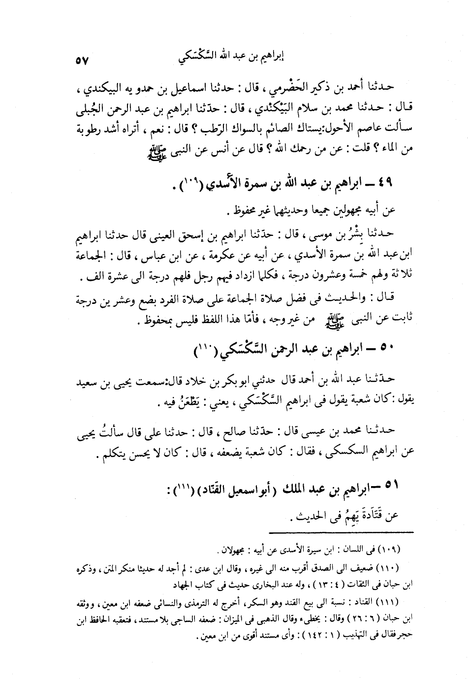 §50 - إِبْرَاهِيمُ بْنُ عَبْدِ الرَّحْمَنِ السَّكْسَكِيُّ حَدَّثَنَا عَبْدُ اللَّهِ بْنُ أَحْمَدَ قَالَ: حَدَّثَنِي أَبُو بَكْرِ بْنُ خَلَّادٍ قَالَ: سَمِعْتُ يَحْيَى بْنَ سَعِيدٍ يَقُولُ: كَانَ شُعْبَةُ يَقُولُ فِي إِبْرَاهِيمَ السَّكْسَكِيِّ يَعْنِي يَطْعُنُ فِيهِ. حَدَّثَنَا مُحَمَّدُ بْنُ عِيسَى قَالَ: حَدَّثَنَا صَالِحٌ قَالَ: حَدَّثَنَا عَلِيٌّ قَالَ: سَأَلْتُ يَحْيَى عَنْ إِبْرَاهِيمَ السَّكْسَكِيِّ فَقَالَ: كَانَ شُعْبَةُ يُضَعِّفُهُ , قَالَ: كَانَ لَا يُحْسِنُ يَتَكَلَّمُ