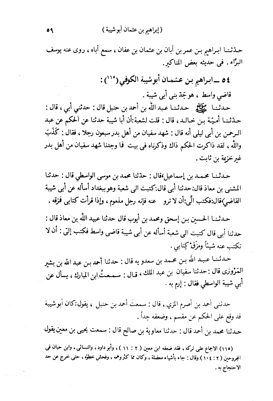 §54 - إِبْرَاهِيمُ بْنُ عُثْمَانَ أَبُو شَيْبَةَ الْكُوفِيُّ قَاضِي وَاسِطٍ هُوَ جَدُّ بَنِي أَبِي شَيْبَةَ. حَدَّثَنَا عَبْدُ اللَّهِ بْنُ أَحْمَدَ بْنِ حَنْبَلٍ قَالَ: حَدَّثَنِي أَبِي قَالَ: حَدَّثَنَا أُمَيَّةُ بْنُ خَالِدٍ قَالَ: قُلْتُ لِشُعْبَةَ: إِنَّ أَبَا شَيْبَةَ حَدَّثَنَا عَنِ الْحَكَمِ عَنْ عَبْدِ الرَّحْمَنِ بْنِ أَبِي لَيْلَى أَنَّهُ قَالَ: شَهِدَ صِفِّينَ مِنْ أَهْلِ بَدْرٍ سَبْعُونَ رَجُلًا , فَقَالَ: كَذَبَ وَاللَّهِ، لَقَدْ ذَاكَرْتُ الْحَكَمَ ذَاكَ وَذَكَرْنَاهُ فِي بَيْتٍ فَمَا وَجَدْنَا شَهِدَ صِفِّينَ مِنْ أَهْلِ بَدْرٍ غَيْرُ خُزَيْمَةَ بْنِ ثَابِتٍ. حَدَّثَنَا مُحَمَّدُ بْنُ إِسْمَاعِيلَ , قَالَ: حَدَّثَنَا مُحَمَّدُ بْنُ مُوسَى الْوَاسِطِيُّ , قَالَ: حَدَّثَنَا الْمُثَنَّى بْنُ مُعَاذٍ قَالَ: حَدَّثَنَا أَبِي قَالَ: كَتَبْتُ إِلَى شُعْبَةَ وَهُوَ بِبَغْدَادَ أَسْأَلُهُ عَنْ أَبِي شَيْبَةَ الْقَاضِي , قَالَ: فَكَتَبَ إِلَيَّ أَنْ لَا تَرْوِ عَنْهُ فَإِنَّهُ رَجُلٌ مَذْمُومٌ، وَإِذَا قَرَأْتَ كِتَابِي فَمَزِّقْهُ. حَدَّثَنَا الْحُسَيْنُ بْنُ إِسْحَاقَ وَمُحَمَّدُ بْنُ أَيُّوبَ , قَالَا: حَدَّثَنَا عُبَيْدُ اللَّهِ بْنُ مُعَاذٍ قَالَ: حَدَّثَنَا أَبِي قَالَ: كَتَبْتُ إِلَى شُعْبَةَ أَسْأَلُهُ عَنْ أَبِي شَيْبَةَ قَاضِي وَاسِطٍ فَكَتَبَ إِلَىَّ أَنْ لَا تَكْتُبْ عَنْهُ شَيْئًا وَمَزِّقْ كِتَابِي. حَدَّثَنَا عَبْدُ اللَّهِ بْنُ مُحَمَّدِ بْنِ سَعْدَوَيْهِ قَالَ: حَدَّثَنَا أَحْمَدُ بْنُ عَبْدِ اللَّهِ بْنِ بَشِيرٍ الْمَرْوَزِيُّ قَالَ: حَدَّثَنَا سُفْيَانُ بْنُ عَبْدِ الْمَلِكِ قَالَ: سَمِعْتُ ابْنَ الْمُبَارَكِ يُسْأَلُ عَنْ أَبِي شَيْبَةَ الْوَاسِطِيِّ فَقَالَ: ارْمِ بِهِ. حَدَّثَنِي أَحْمَدُ بْنُ أَصْرَمَ الْمِزِّيُّ قَالَ: سَمِعْتُ أَحْمَدَ بْنَ مُحَمَّدِ بْنِ حَنْبَلٍ يَقُولُ: كَانَ أَبُو شَيْبَةَ قَدْ وَقَعَ عَلَى الْحَكَمِ عَنْ مِقْسَمٍ وَضَعَّفَهُ جِدًّا. حَدَّثَنَا مُحَمَّدُ بْنُ أَحْمَدَ قَالَ: حَدَّثَنَا مُعَاوِيَةُ بْنُ صَالِحٍ قَالَ: سَمِعْتُ يَحْيَى بْنَ مَعِينٍ يَقُولُ: إِبْرَاهِيمُ بْنُ عُثْمَانَ أَبُو شَيْبَةَ الْكُوفِيُّ ضَعِيفٌ. حَدَّثَنِي آدَمُ بْنُ مُوسَى قَالَ: سَمِعْتُ الْبُخَارِيَّ قَالَ: إِبْرَاهِيمُ بْنُ عُثْمَانَ أَبُو شَيْبَةَ الْعَبْسِيُّ مَوْلَاهُمْ قَاضِي وَاسِطٍ سَكَتُوا عَنْهُ