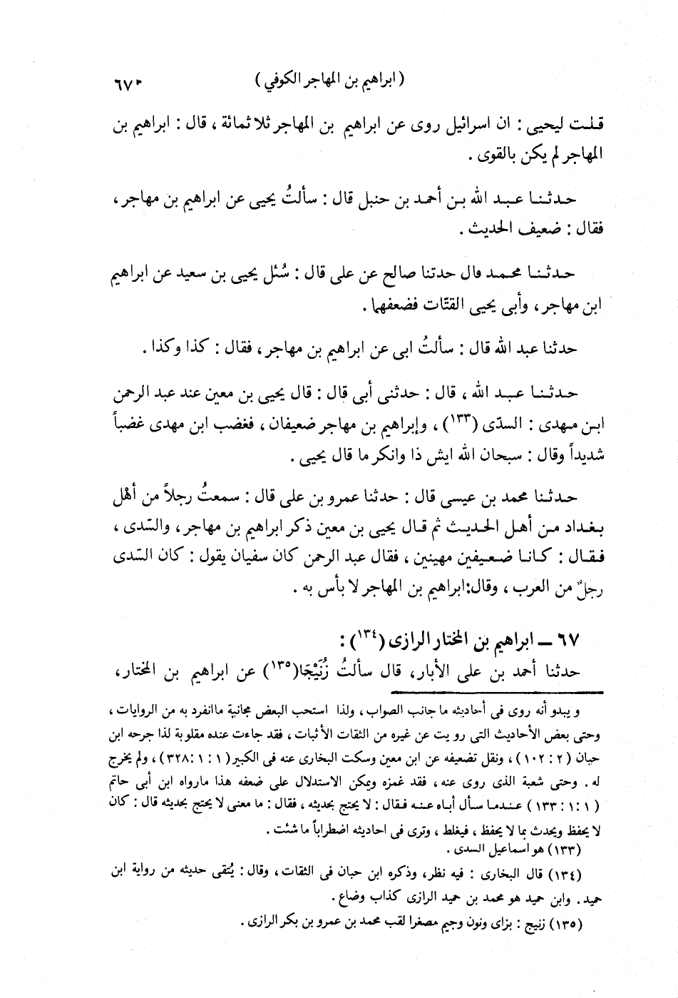§67 - إِبْرَاهِيمُ بْنُ الْمُخْتَارِ الرَّازِيُّ حَدَّثَنَا أَحْمَدُ بْنُ عَلِيٍّ الْأَبَّارُ قَالَ: سَأَلْتُ زُنَيْجًا عَنْ إِبْرَاهِيمَ بْنِ الْمُخْتَارِ فَقَالَ: تَرَكْتُهُ، وَلَمْ يَرْضَهُ. حَدَّثَنَا آدَمُ بْنُ مُوسَى قَالَ: سَمِعْتُ الْبُخَارِيَّ قَالَ: إِبْرَاهِيمُ بْنُ الْمُخْتَارِ أَبُو إِسْمَاعِيلَ التَّمِيمِيُّ مِنْ أَهْلِ خَوَارَ، سَمِعَ مُحَمَّدَ بْنَ إِسْحَاقَ، لَا أَدْرِي كَيْفَ حَدِيثُهُ؟