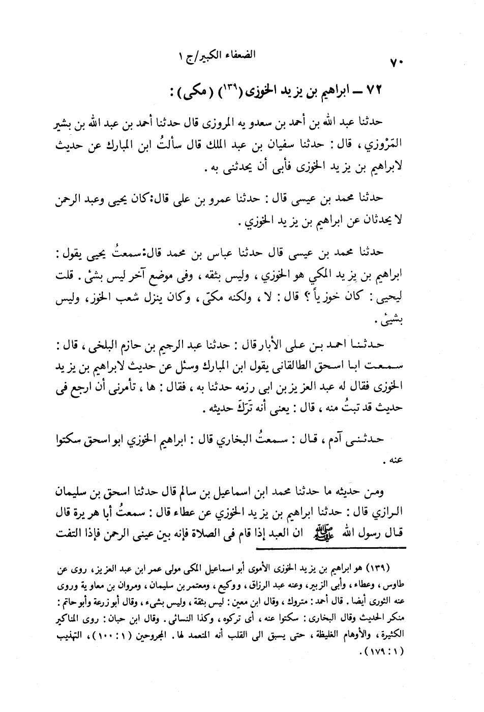 §72 - إِبْرَاهِيمُ بْنُ يَزِيدَ الْخُوزِيُّ، مَكِّيٌّ حَدَّثَنَا عَبْدُ اللَّهِ بْنُ أَحْمَدَ بْنِ سَعْدَوَيْهِ الْمَرْوَزِيُّ قَالَ: حَدَّثَنَا أَحْمَدُ بْنُ عَبْدِ اللَّهِ بْنِ بَشِيرٍ الْمَرْوَزِيُّ قَالَ: حَدَّثَنَا سُفْيَانُ بْنُ عَبْدِ الْمَلِكِ قَالَ: سَأَلْتُ ابْنَ الْمُبَارَكِ عَنْ حَدِيثٍ لِإِبْرَاهِيمَ بْنِ يَزِيدَ الْخُوزِيِّ فَأَبَى أَنْ يُحَدِّثُنِيَ بِهِ. حَدَّثَنَا مُحَمَّدُ بْنُ عِيسَى قَالَ: حَدَّثَنَا عَمْرُو بْنُ عَلِيٍّ قَالَ: كَانَ يَحْيَى , وَعَبْدُ الرَّحْمَنِ لَا يُحَدِّثَانِ عَنْ إِبْرَاهِيمَ بْنِ يَزِيدَ الْخُوزِيِّ. حَدَّثَنَا مُحَمَّدُ بْنُ عِيسَى قَالَ: حَدَّثَنَا عَبَّاسُ بْنُ مُحَمَّدٍ قَالَ: سَمِعْتُ يَحْيَى يَقُولُ: إِبْرَاهِيمُ بْنُ يَزِيدَ الْمَكِّيُّ هُوَ الْخُوزِيُّ وَلَيْسَ بِثِقَةٍ، وَفِي مَوْضِعٍ آخَرَ: لَيْسَ بِشَيْءٍ , قُلْتُ لِيَحْيَى: كَانَ خُوزِيًّا؟ قَالَ: لَا وَلَكِنَّهُ مَكِّيٌّ , وَكَانَ يَنْزِلُ شِعْبَ الْخُوزِ وَلَيْسَ بِشَيْءٍ. حَدَّثَنَا أَحْمَدُ بْنُ عَلِيٍّ الْأَبَّارُ قَالَ: حَدَّثَنَا عَبْدُ الرَّحِيمِ بْنُ حَازِمٍ الْبَلْخِيُّ قَالَ: سَمِعْتُ أَبَا إِسْحَاقَ الطَّالْقَانِيَّ , يَقُولُ ابْنُ الْمُبَارَكِ وَسُئِلَ عَنْ حَدِيثٍ لِإِبْرَاهِيمَ بْنِ يَزِيدَ الْخُوزِيِّ فَقَالَ لَهُ عَبْدُ الْعَزِيزِ بْنُ أَبِي رِزْمَةَ حَدِّثْنَا بِهِ، فَقَالَ: هَاهْ , تَأْمُرُنِي أَنْ أَرْجِعَ فِي حَدِيثٍ قَدْ تُبْتُ مِنْهُ قَالَ: يَعْنِي أَنَّهُ قَدْ تَرَكَ حَدِيثَهُ. حَدَّثَنِي آدَمُ قَالَ: سَمِعْتُ الْبُخَارِيَّ قَالَ: إِبْرَاهِيمُ الْخُوزِيُّ أَبُو إِسْحَاقَ سَكَتُوا عَنْهُ