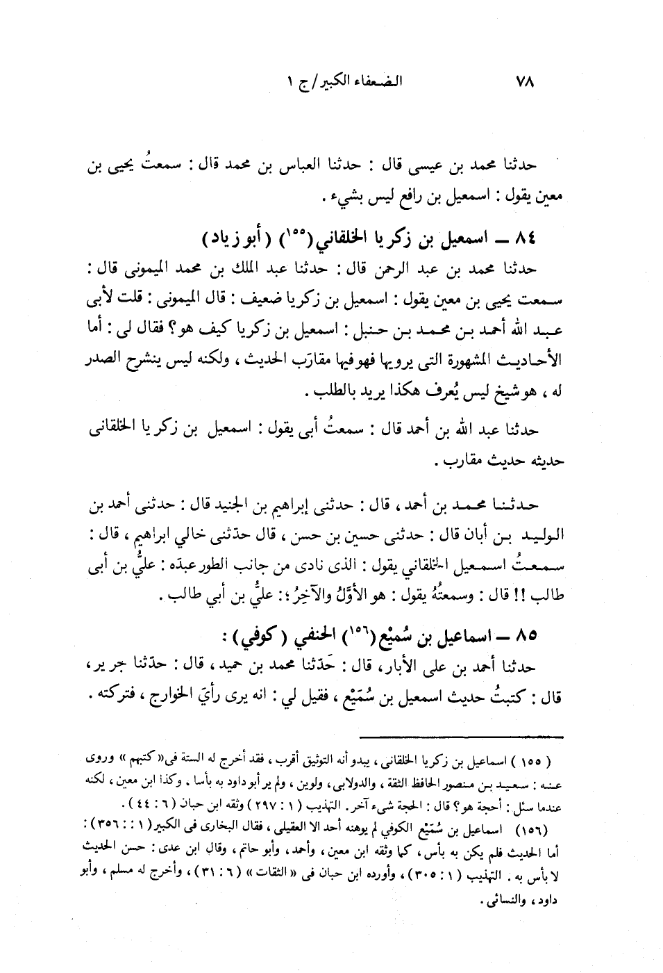 §84 - إِسْمَاعِيلُ بْنُ زَكَرِيَّا الْخُلْقَانِيُّ أَبُو زِيَادٍ حَدَّثَنَا مُحَمَّدُ بْنُ عَبْدِ الرَّحْمَنِ قَالَ: حَدَّثَنَا عَبْدُ الْمَلِكِ بْنُ مُحَمَّدٍ الْمَيْمُونِيُّ قَالَ: سَمِعْتُ يَحْيَى بْنَ مَعِينٍ يَقُولُ: إِسْمَاعِيلُ بْنُ زَكَرِيَّا ضَعِيفٌ. قَالَ الْمَيْمُونِيُّ: فَقُلْتُ لِأَبِي عَبْدِ اللَّهِ أَحْمَدَ بْنِ مُحَمَّدِ بْنِ حَنْبَلٍ: إِسْمَاعِيلُ بْنُ زَكَرِيَّا كَيْفَ هُوَ؟ فَقَالَ لِي: أَمَّا الْأَحَادِيثُ الْمَشْهُورَةُ الَّتِي يَرْوِيهَا فَهُوَ فِيهَا مُقَارِبُ الْحَدِيثِ وَلَكِنَّهُ لَيْسَ يَنْشَرِحُ الصَّدْرُ لَهُ , هُوَ شَيْخٌ لَيْسَ يُعْرَفُ هَكَذَا يُرِيدُ بِالطَّلَبِ. حَدَّثَنَا عَبْدُ اللَّهِ بْنُ أَحْمَدَ قَالَ: سَمِعْتُ أَبِي يَقُولُ: إِسْمَاعِيلُ بْنُ زَكَرِيَّا الْخُلْقَانِيُّ حَدِيثُهُ حَدِيثٌ مُقَارِبٌ