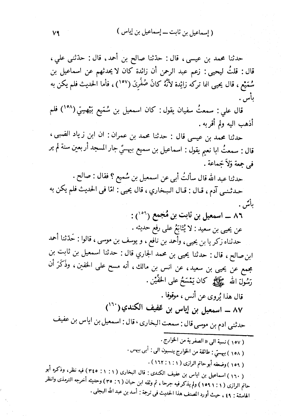 §87 - إِسْمَاعِيلُ بْنُ إِيَاسَ بْنِ عَفِيفٍ الْكِنْدِيُّ حَدَّثَنِي آدَمُ بْنُ مُوسَى قَالَ: سَمِعْتُ الْبُخَارِيَّ قَالَ: إِسْمَاعِيلُ بْنُ إِيَاسَ بْنِ عَفِيفٍ الْكِنْدِيُّ رَوَى عَنْهُ يَحْيَى بْنُ أَبِي الْأَشْعَثِ وَلَمْ يَصِحَّ حَدِيثُهُ , وَلَمْ يَثْبُتْ
