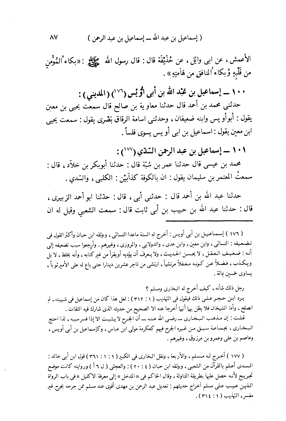 §101 - إِسْمَاعِيلُ بْنُ عَبْدِ الرَّحْمَنِ السُّدِّيُّ مُحَمَّدُ بْنُ عِيسَى , قَالَ: حَدَّثَنَا عُمَرُ بْنُ شَبَّةَ قَالَ: حَدَّثَنَا أَبُو بَكْرِ بْنُ خَلَّادٍ قَالَ: سَمِعْتُ الْمُعْتَمِرَ بْنَ سُلَيْمَانَ يَقُولُ: إِنَّ بِالْكُوفَةِ كَذَّابِينَ: الْكَلْبِيُّ , وَالسُّدِّيُّ. حَدَّثَنَا عَبْدُ اللَّهِ بْنُ أَحْمَدَ قَالَ: حَدَّثَنِي أَبِي قَالَ: حَدَّثَنَا أَبُو أَحْمَدَ الزُّبَيْرِيُّ قَالَ: حَدَّثَنَا عَبْدُ اللَّهِ بْنُ حَبِيبِ بْنِ أَبِي ثَابِتٍ قَالَ: سَمِعْتُ الشَّعْبِيَّ وَقِيلَ لَهُ: إِنَّ إِسْمَاعِيلَ السُّدِّيَّ قَدْ أُعْطِيَ حَظًّا مِنْ عَلِمٍ بِالْقُرْآنِ , فَقَالَ: إِنَّ إِسْمَاعِيلَ قَدْ أُعْطِيَ حَظًّا مِنَ الْجَهْلِ بِالْقُرْآنِ. حَدَّثَنَا عَبْدُ اللَّهِ بْنُ أَحْمَدَ قَالَ: قُلْتُ لِيَحْيَى بْنِ مَعِينٍ: إِبْرَاهِيمُ بْنُ الْمُهَاجِرِ , وَالسُّدِّيُّ مُتَقَارِبَانِ فِي الضَّعْفِ. حَدَّثَنَا مُحَمَّدُ بْنُ عِيسَى قَالَ: حَدَّثَنَا عَمْرُو بْنُ عَلِيٍّ قَالَ: سَمِعْتُ يَحْيَى بْنَ مَعِينٍ وَذَكَرَ إِبْرَاهِيمَ بْنَ الْمُهَاجِرِ , وَالسُّدِّيَّ , فَقَالَ: كَانَا ضَعِيفَيْنِ مَهِينَيْنِ. حَدَّثَنَا مُحَمَّدٌ قَالَ: حَدَّثَنَا عَبَّاسٌ قَالَ: سَمِعْتُ يَحْيَى يَقُولُ: إِبْرَاهِيمُ بْنُ مُهَاجِرٍ , وَأَبُو يَحْيَى الْقَتَّاتُ وَالسُّدِّيُّ فِي حَدِيثِهِمْ ضَعْفٌ. حَدَّثَنَا الْخَضِرُ بْنُ دَاوُدَ قَالَ: حَدَّثَنَا أَحْمَدُ بْنُ مُحَمَّدٍ قَالَ: قُلْتُ لِأَبِي عَبْدِ اللَّهِ: السُّدِّيُّ كَيْفَ هُوَ؟ قَالَ: أُخْبِرُكَ أَنَّ حَدِيثَهُ لَمُقَارِبٌ، وَإِنَّهُ لَحَسَنُ الْحَدِيثِ إِلَّا أَنَّ هَذَا التَّفْسِيرَ الَّذِي يَجِيءُ بِهِ أَسْبَاطٌ عَنْهُ فَجَعَلَ يَسْتَعْظِمُهُ , قُلْتُ ذَاكَ إِنَّمَا يَرْجِعُ إِلَى قَوْلِ السُّدِّيِّ , فَقَالَ: مِنْ أَيْنَ؟ وَقَدْ جَعَلَ لَهُ أَسَانِيدَ مَا أَدْرِي مَا ذَاكَ. حَدَّثَنَا جَعْفَرُ بْنُ مُحَمَّدٍ قَالَ: حَدَّثَنَا إِبْرَاهِيمُ بْنُ يَعْقُوبَ قَالَ: سَمِعْتُ عَلِيَّ بْنَ الْحُسَيْنِ بْنِ وَاقِدٍ يُحَدِّثُ عَنْ أَبِيهِ قَالَ: قَدِمْتُ الْكُوفَةَ فَأَتَيْتُ السُّدِّيَّ فَسَأَلْتُهُ عَنْ تَفْسِيرِ آيَةٍ مِنْ كِتَابِ اللَّهِ فَحَدَّثَنِي بِهَا فَلَمْ أُتِمَّ مَجْلِسِي حَتَّى سَمِعْتُهُ يَشْتُمُ أَبَا بَكْرٍ وَعُمَرَ رَضِيَ اللَّهُ عَنْهُمَا فَلَمْ أَعُدْ إِلَيْهِ