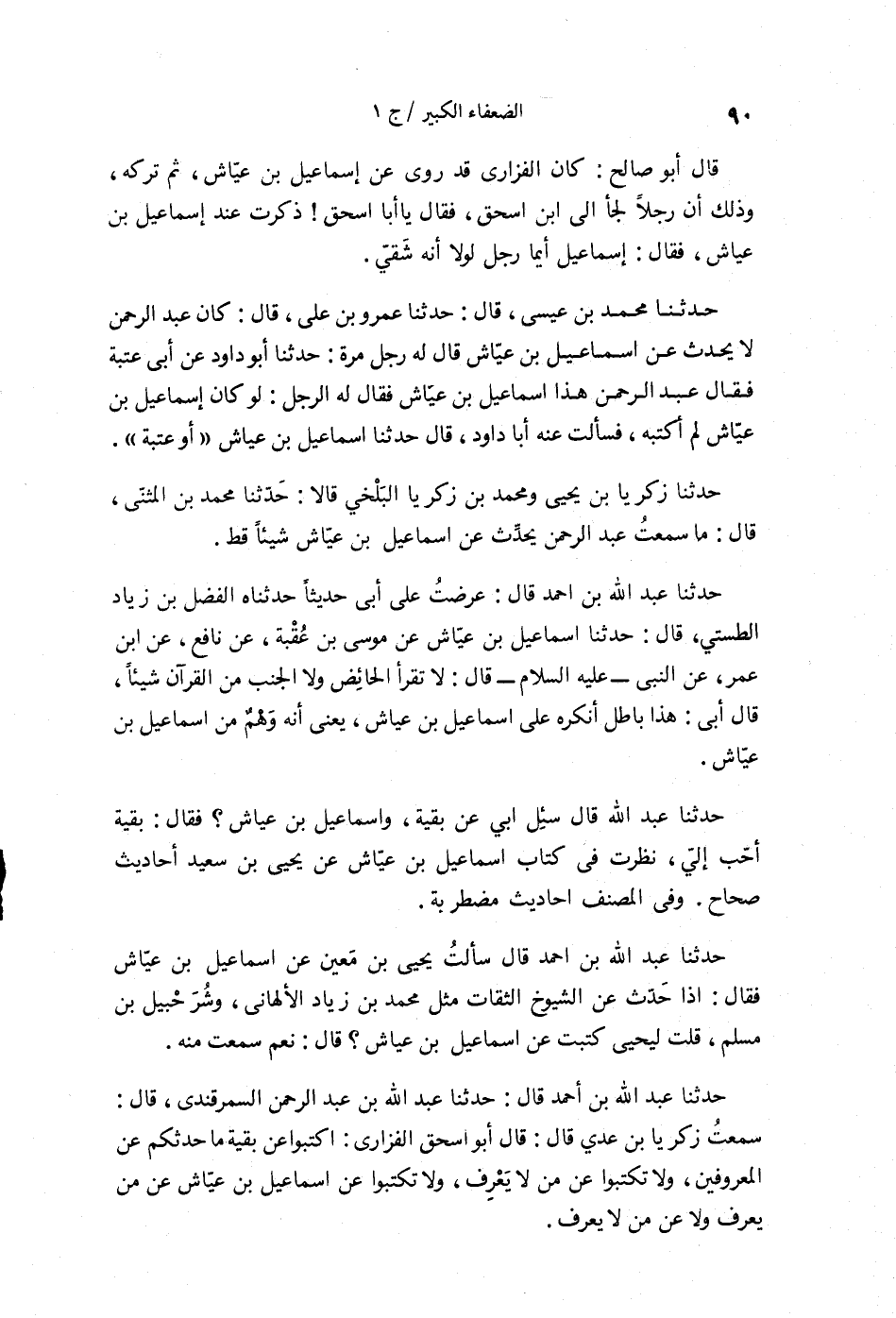 حَدَّثَنَا عَبْدُ اللَّهِ بْنُ أَحْمَدَ , قَالَ: عَرَضْتُ عَلَى أَبِي حَدِيثًا حَدَّثَنَا الْفَضْلُ بْنُ زِيَادِ الطِّسْتِيُّ , قَالَ: حَدَّثَنَا إِسْمَاعِيلُ بْنُ عَيَّاشٍ عَنْ مُوسَى بْنِ عُقْبَةَ , عَنْ نَافِعٍ , عَنِ ابْنِ عُمَرَ , عَنِ النَّبِيِّ عَلَيْهِ السَّلَامُ قَالَ: §«لَا تَقْرَأُ الْحَائِضُ , وَلَا الْجُنُبُ مِنَ الْقُرْآنِ شَيْئًا» قَالَ أَبِي: هَذَا بَاطِلٌ أَنْكَرَهُ عَلَى إِسْمَاعِيلَ بْنِ عَيَّاشٍ , يَعْنِي أَنَّهُ وَهْمٌ مِنْ إِسْمَاعِيلَ بْنِ عَيَّاشٍ. حَدَّثَنَا عَبْدُ اللَّهِ قَالَ: سُئِلَ أَبِي عَنْ بَقِيَّةَ وَإِسْمَاعِيلَ بْنِ عَيَّاشٍ؟ فَقَالَ: بَقِيَّةُ أَحَبُّ إِلَيَّ , نَظَرْتُ فِي كِتَابِ إِسْمَاعِيلَ بْنِ عَيَّاشٍ , عَنْ يَحْيَى بْنِ سَعِيدٍ أَحَادِيثٌ صِحَاحٌ. وَفِي الْمُصَنَّفِ أَحَادِيثُ مُضْطَرِبَةٌ. حَدَّثَنَا عَبْدُ اللَّهِ بْنُ أَحْمَدَ قَالَ: سَأَلْتُ يَحْيَى بْنَ مَعِينٍ , عَنْ إِسْمَاعِيلَ بْنِ عَيَّاشٍ فَقَالَ: إِذَا حَدَّثَ عَنِ الشُّيُوخِ الثِّقَاتِ مِثْلِ مُحَمَّدِ بْنِ زِيَادٍ الْأَلْهَانِيِّ وَشُرَحْبِيلَ بْنِ مُسْلِمٍ، قُلْتُ لِيَحْيَى: كَتَبْتَ عَنْ إِسْمَاعِيلَ بْنِ عَيَّاشٍ؟ قَالَ: نَعَمْ، سَمِعْتُ مِنْهُ. حَدَّثَنَا عَبْدُ اللَّهِ بْنُ أَحْمَدَ قَالَ: حَدَّثَنَا عَبْدُ اللَّهِ بْنُ عَبْدِ الرَّحْمَنِ السَّمَرْقَنْدِيُّ قَالَ: سَمِعْتُ زَكَرِيَّا بْنَ عَدِيٍّ قَالَ: قَالَ أَبُو إِسْحَاقَ الْفَزَارِيُّ: اكْتُبُوا عَنْ بَقِيَّةَ مَا حَدَّثَكُمْ عَنِ الْمَعْرُوفِينَ، وَلَا تَكْتُبُوا عَنْهُ عَنْ مَنْ لَا يَعْرِفُ , وَلَا تَكْتُبُوا عَنْ أِسْمَاعِيلَ بْنِ عَيَّاشٍ عَنْ مَنْ يَعْرِفُ , وَلَا عَنْ مَنْ لَا يَعْرِفُ