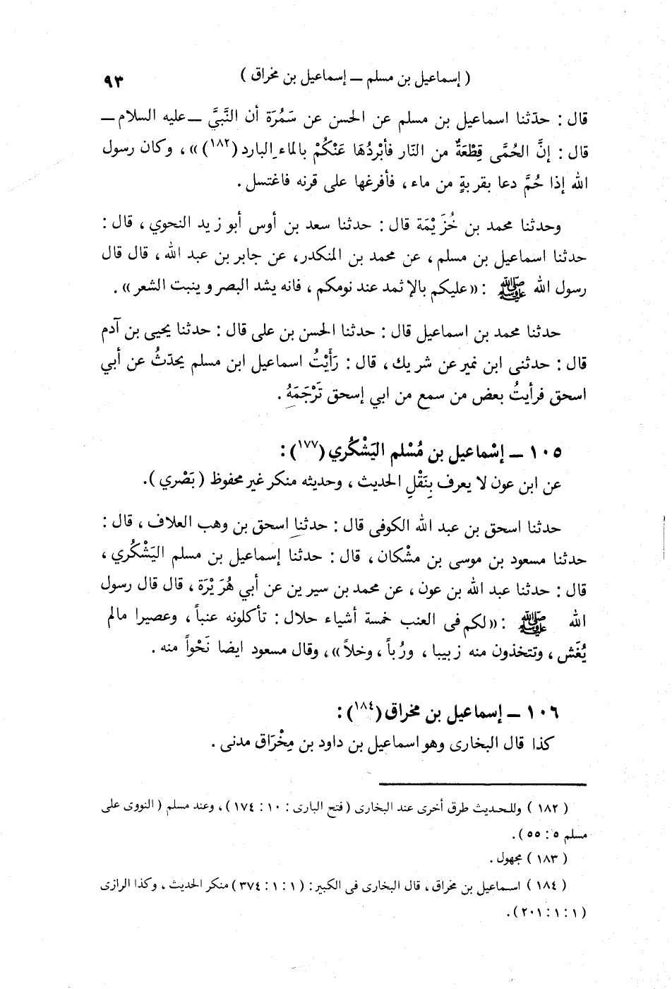 §106 - إِسْمَاعِيلُ بْنُ مِخْرَاقٍ كَذَا قَالَ الْبُخَارِيُّ وَهُوَ إِسْمَاعِيلُ بْنُ دَاوُدَ بْنِ مِخْرَاقٍ مَدَنِيٌّ. حَدَّثَنِي آدَمُ بْنُ مُوسَى قَالَ: سَمِعْتُ الْبُخَارِيَّ قَالَ: إِسْمَاعِيلُ بْنُ مِخْرَاقٍ مُنْكَرُ الْحَدِيثِ مَدَنِيٌّ
