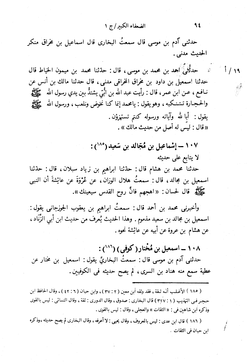 §108 - إِسْمَاعِيلُ بْنُ مُخْتَارٍ، كُوفِيٌّ حَدَّثَنِي آدَمُ بْنُ مُوسَى قَالَ: سَمِعْتُ الْبُخَارِيَّ يَقُولُ: إِسْمَاعِيلُ بْنُ مُخْتَارٍ عَنْ عَطِيَّةَ سَمِعَ مِنْهُ هَنَّادُ بْنُ السُّرَى , لَمْ يَصِحُّ حَدِيثُهُ فِي الْكُوفِيِّينَ