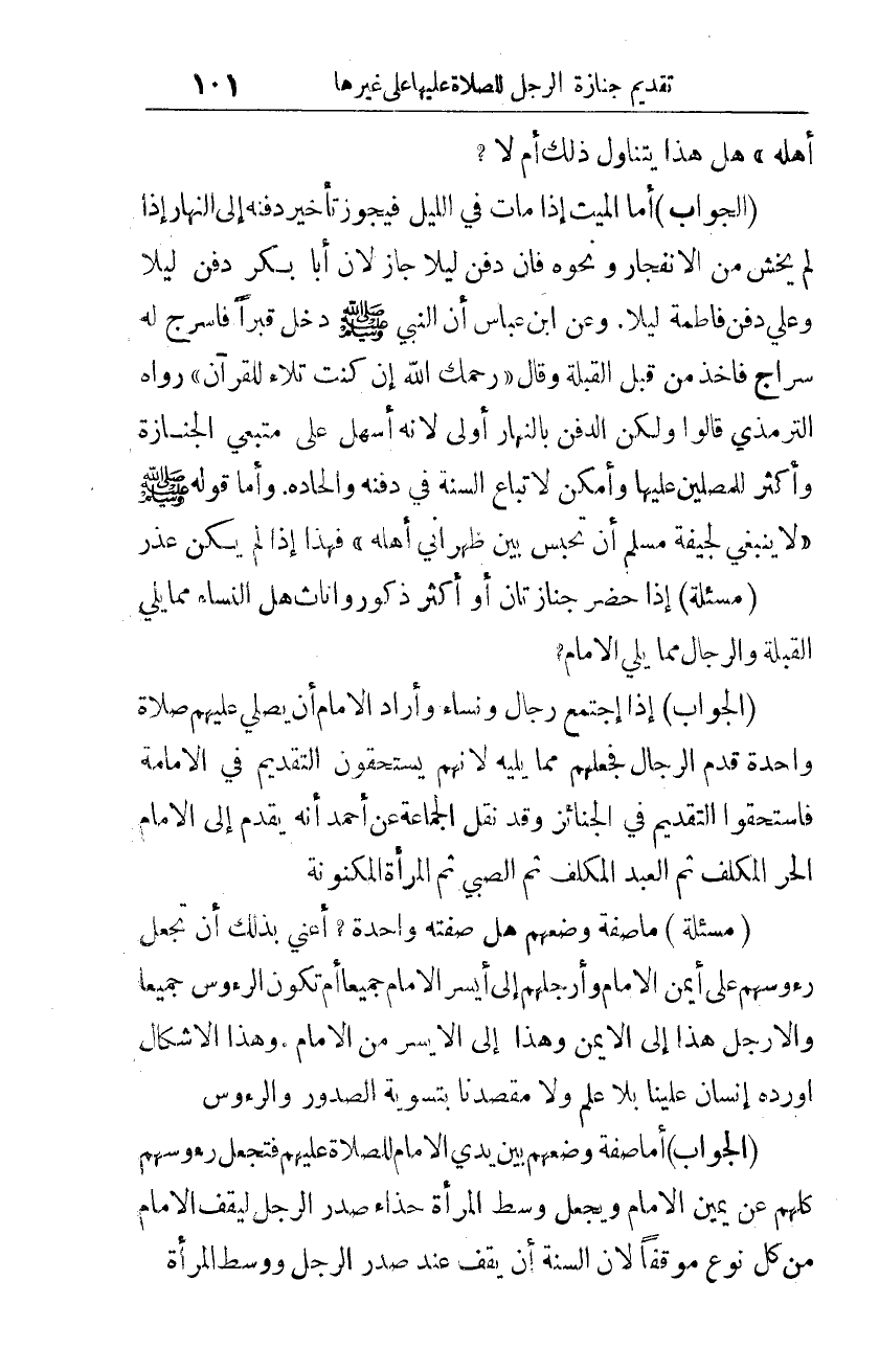 (الجواب): إذا اجتمع رجال ونساء وأراد الإمام أن يصلي عليهم صلاة واحدة، قدم الرجال فجعلهم مما يليه؛ لأنهم يستحقون التقديم في الإمامة فاستحقوا التقديم في الجنائز، وقد نقل الجماعة عن أحمد أنه يقدم إلى الإمام الحر المكلف، ثم العبد المكلف، ثم الصبي، ثم المرأة المكنونة.