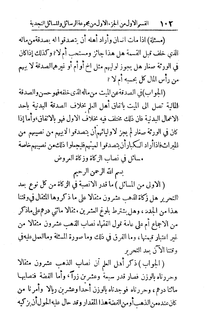(الأولى من المسائل): ما قدر الأنصبة في الزكاة من كل نوع بعد التحرير هل زكاة الذهب عشرون مثقالا على ما ذكروها المثقال في وقتنا هذا من الجدد وهل يشترط بلوغ العشرين مثقالا مائتي درهم على ما ذكر من الإجماع، أم على عامة قول الفقهاء نصاب الذهب عشرون مثقالا من غير اعتبار قيمتها وما الفرق في ذلك وما صورة المسألة؟ وما العمل عليه في وقتنا الآن بعد التحرير