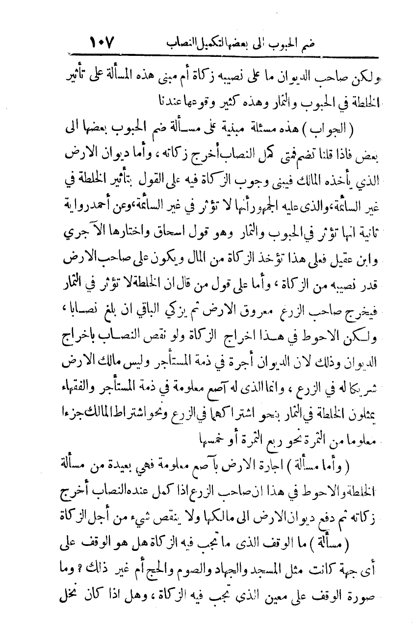 (الجواب): هذه مسألة مبنية على مسألة ضم الحبوب بعضها إلى بعض؛ فإذا قلنا تضم فمتى كمل النصاب أخرج زكاته. وأما ديوان الأرض الذي يأخذه المالك فيبنى وجوب الزكاة فيه على القول بتأثير الخلطة في غير السائمة؛ والذي عليه الجمهور أنها لا تؤثر في غير السائمة. وعن أحمد رواية ثانية أنها تؤثر في الحبوب والثمار، وهو قول إسحاق، واختارها الآجري وابن عقيل.