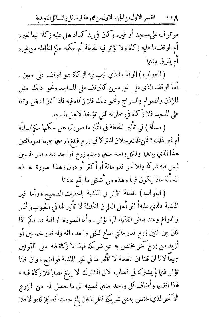 (الجواب): الخلطة تؤثر في الماشية بالحديث الصحيح، وأما غير الماشية فالذي عليه أكثر أهل العلم أن الخلطة لا تأثير لها في الحبوب والثمار والدراهم، وعند بعض الفقهاء أنها تؤثر. وأما الصورة الواقعة عندكم إذا كان بين اثنين زرع قدر مائتي صاع لكل واحد مائة وله قدر خمسين أو أزيد من زرع آخر مختص به عن شريكه، فهذا لا زكاة فيه على القولين جميعا، لأنا إن قلنا أن الخلطة لا تأثير لها في غير الماشية فواضح؛ وإن قلنا تؤثر فهما لم يشتركا في نصاب، لأن المشترك لا يبلغ نصابا فلا زكاة فيه. فإذا اقتسما وأضاف كل واحد منهما نصيبه إلى ما حصل له من الزرع الآخر الذي اختص به عن شريكه نظرنا، فإن بلغ حصته نصابا زكاه، وإلا فلا.