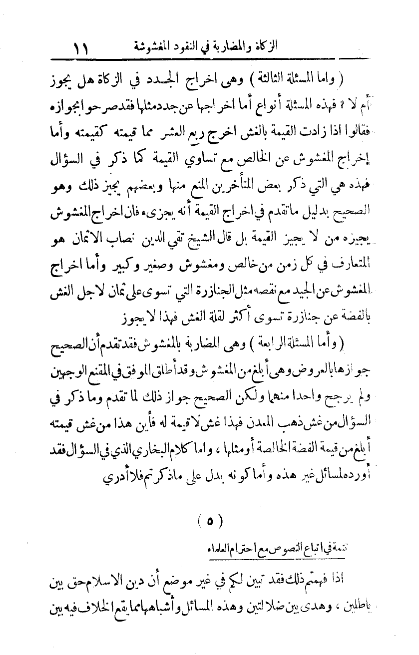 (وأما المسألة الرابعة): وهي المضاربة بالمغشوش، فقد تقدم أن الصحيح جوازها بالعروض، وهي أبلغ من المغشوش؛ وقد أطلق الموفق في المقنع الوجهين، ولم يرجح واحدا منهما، ولكن الصحيح جواز ذلك لما تقدم. وما ذكر في السؤال من غش ذهب المعدن، فهذا غش لا قيمة له؛ فأين هذا من غش قيمته أبلغ من قيمة الفضة الخالصة أو مثلها