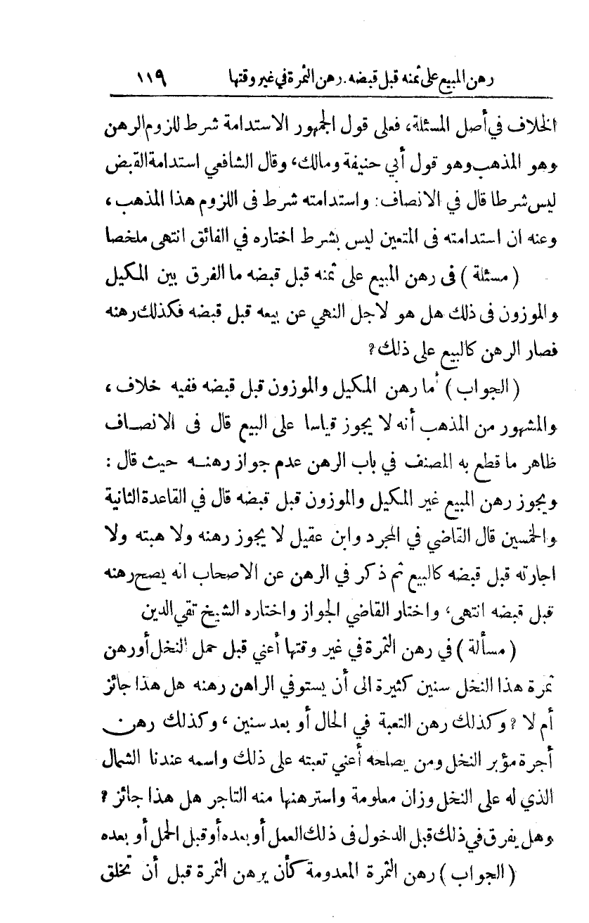 (الجواب): أما رهن المكيل والموزون قبل قبضه ففيه خلاف، والمشهور من المذهب أنه لا يجوز قياسا على البيع، قال في الإنصاف: ظاهر ما قطع به المصنف في باب الرهن عدم جواز رهنه، حيث قال: ويجوز رهن المبيع غير المكيل والموزون قبل قبضه.