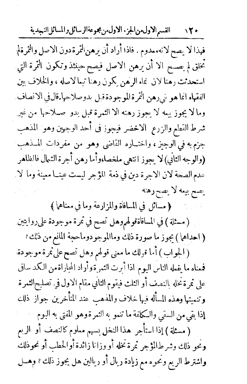 (الجواب): أما قولك: ما معنى قولهم، وهل تصح على ثمرة موجودة فمعناه ما يفعله الناس اليوم إذا أبرت الثمرة وأراد المجازاة من الكد، ساقى على ثمرة نخله بالنصف أو الثلث، فيقوم الثاني مقام الأول في تصليح الثمرة وتنميتها؛ وهذه المسألة فيها خلاف، والمذهب عند المتأخرين جواز ذلك إذا بقي من السقي والكلفة ما تنمو به الثمرة، وهو المفتى به اليوم.