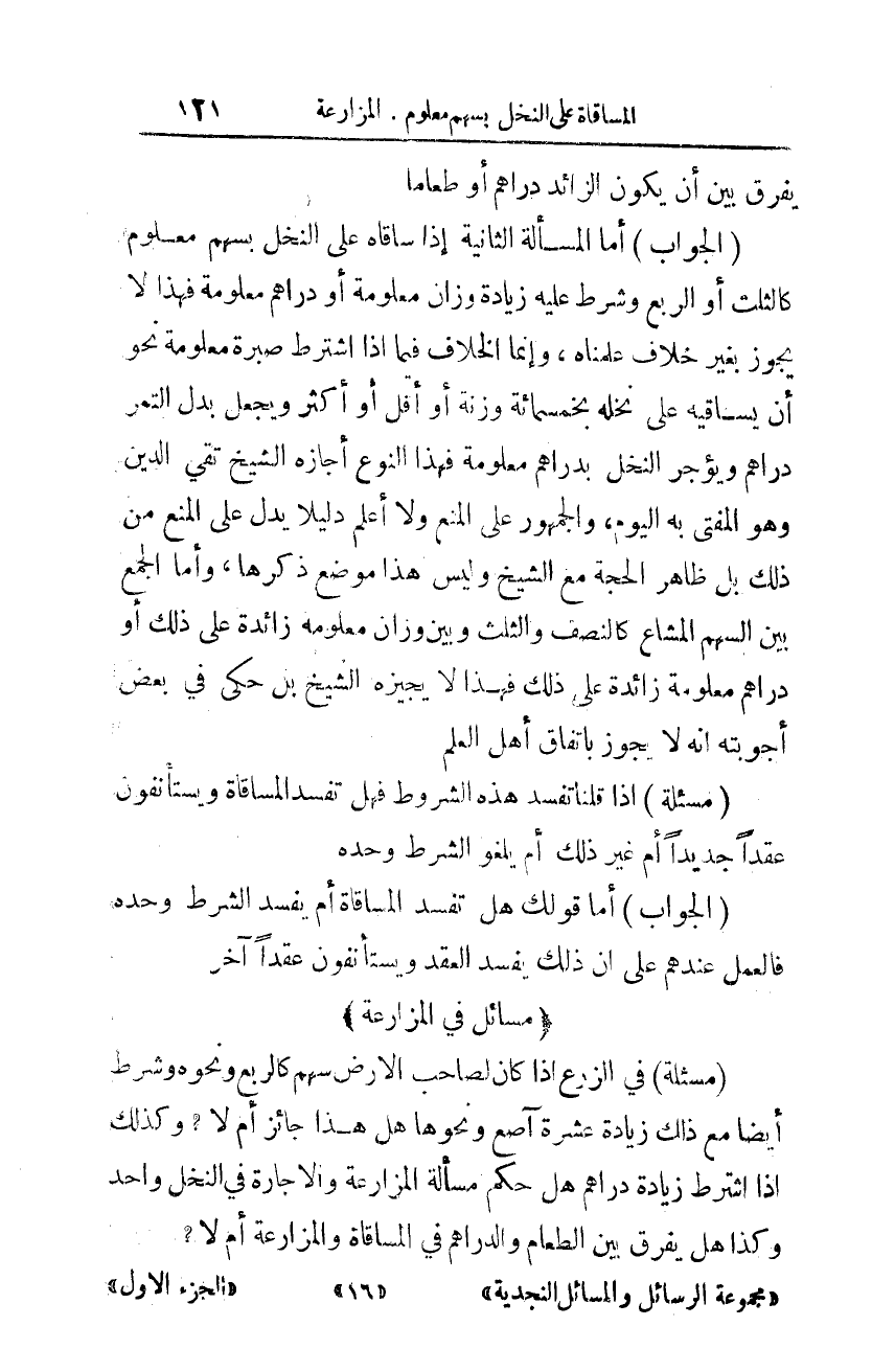 (الجواب): أما المسألة الثانية إذا ساقاه على النخل بسهم معلوم كالثلث أو الربع، وشرط عليه زيادة وزان معلومة أو دراهم معلومة، فهذا لا يجوز بغير خلاف علمناه، وإنما الخلاف فيما إذا اشترط صبرة معلومة، نحو أن يساقيه على نخله بخمسمائة وزنة أو أقل أو أكثر، ويجعل بدل التمر دراهم، ويؤجر النخل بدراهم معلومة، فهذا النوع أجازه الشيخ تقي الدين، وهو المفتى به اليوم.